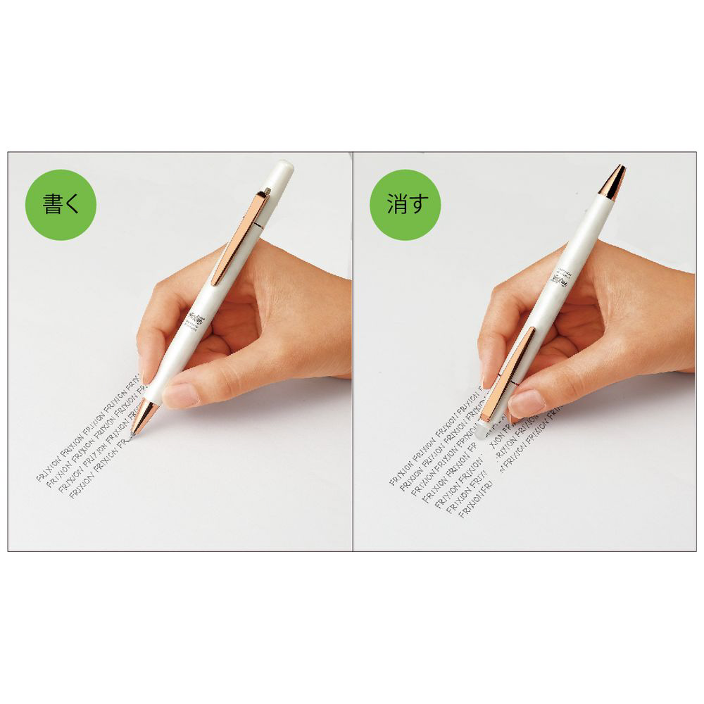 「フリクションインキ」には消色温度が設定されているため、筆跡をボディ後部の専用ラバーで擦ることで生じる摩擦熱によりインキの色が無色に変わり、筆跡を消すことができます。