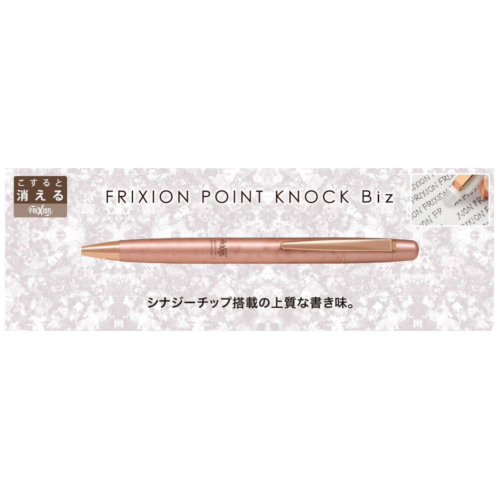 『フリクションポイント ノックビズ』は、こすると消える「フリクション」の特長と、「シナジーチップ」の特長を活かし、スムーズな書き出しとなめらかな書き味を実現した超極細の消せるボールペンです。