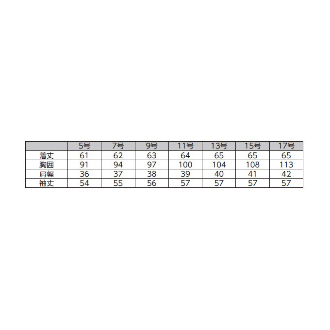 | 仕様1 | 仕上がり寸法(cm) 17号:着丈65、胸囲113、肩幅42、袖丈57 |