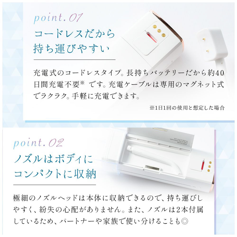 | 付属品 | ノズル×2、専用USBケーブル(マグネット式)×1、携帯用ケース×1、取扱説明書×1、保証書×1 |