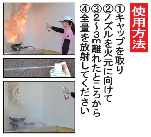 強化液消火剤を小さなエアゾール缶に入れ片手でプシュット簡単に消火できます