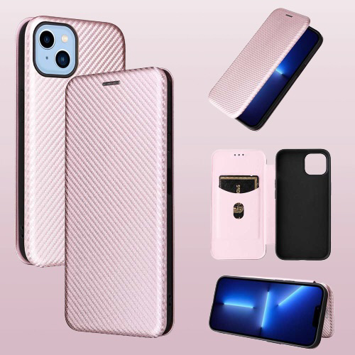 iPhone 14 Plus用カーボンファイバー製手帳型ケース(ピンク)
