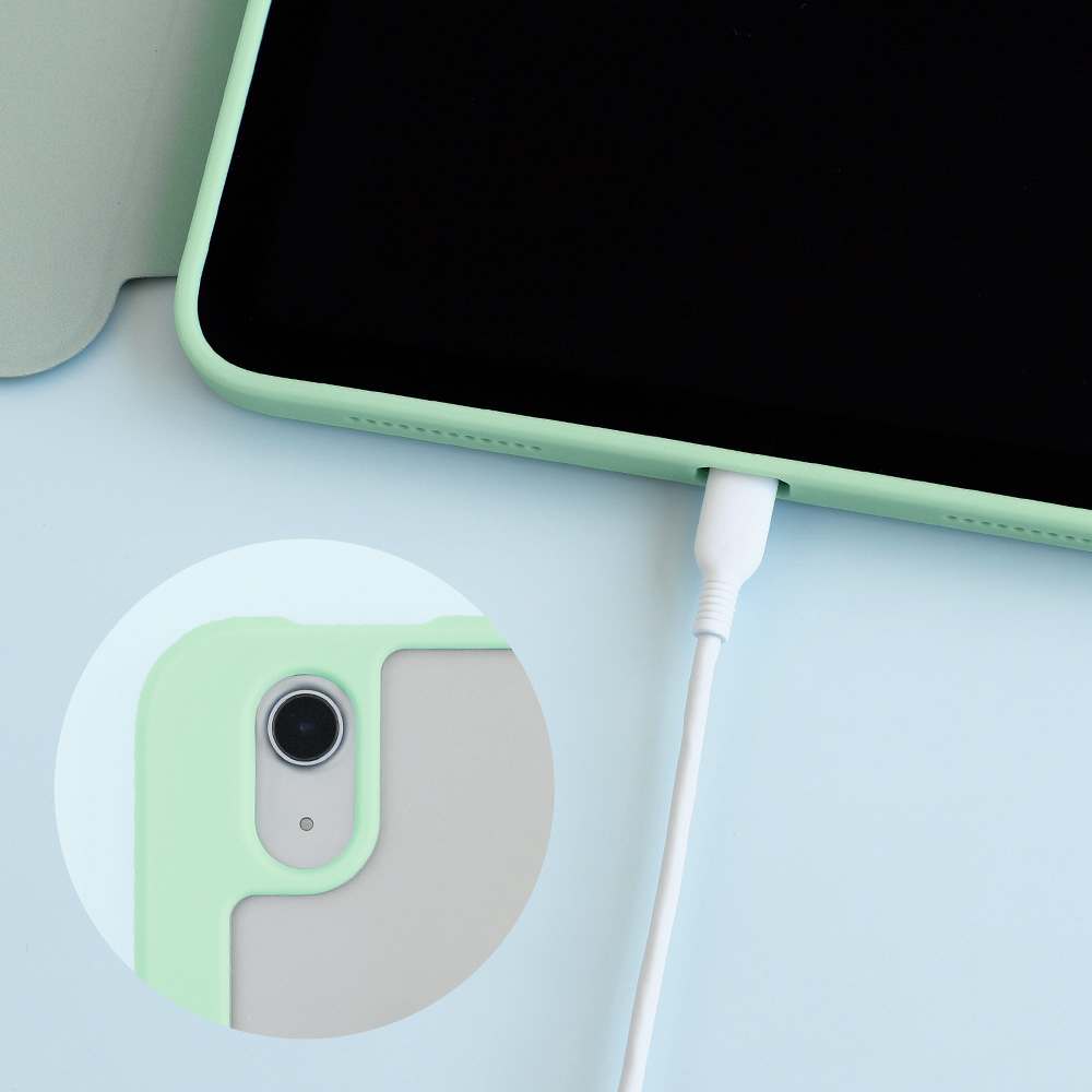 本体の充電コネクタやカメラにケースが重ならないので、充電や写真/動画の撮影を普段通り行うことができます。また、トップボタンや音量調節のボタンも操作できるので、Touch IDで電源を入れたり音量の上げ下げも問題なくできます。※カバーを取り付けた状態でiPadのSmart Connectorをお使いいただくことはできません。