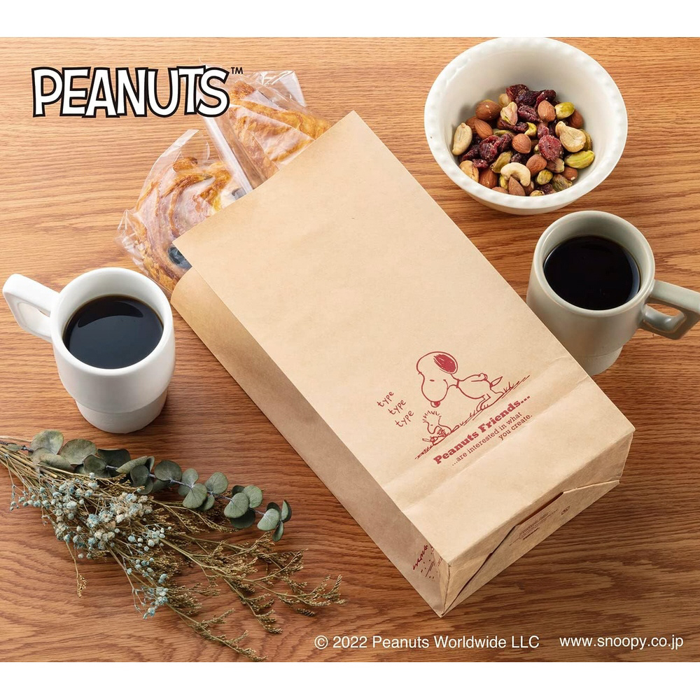 角底タイプのクラフトペーパーバッグ、シンプルにピーナッツキャラクター達をあしらい、落ち着いた雰囲気のカフェスタイル仕様。