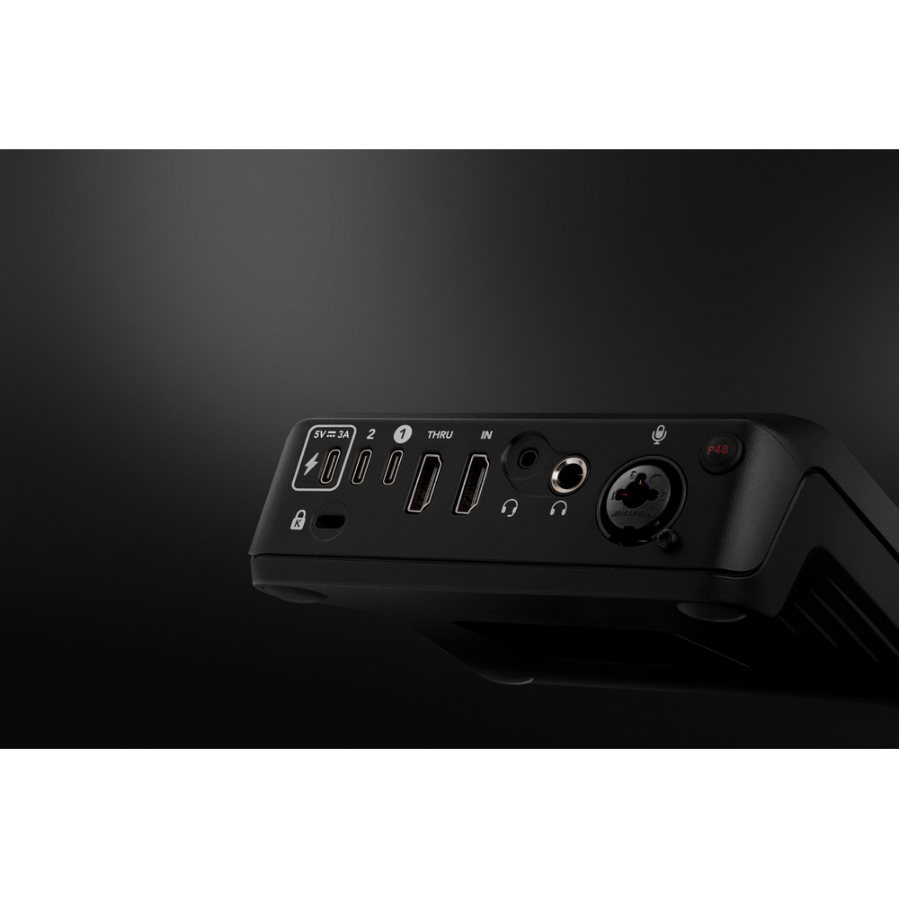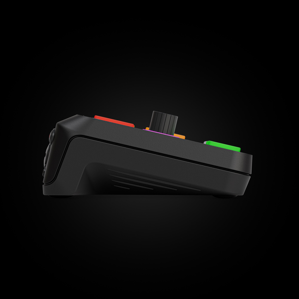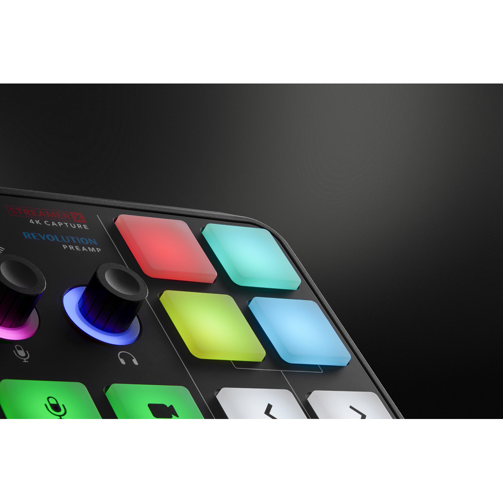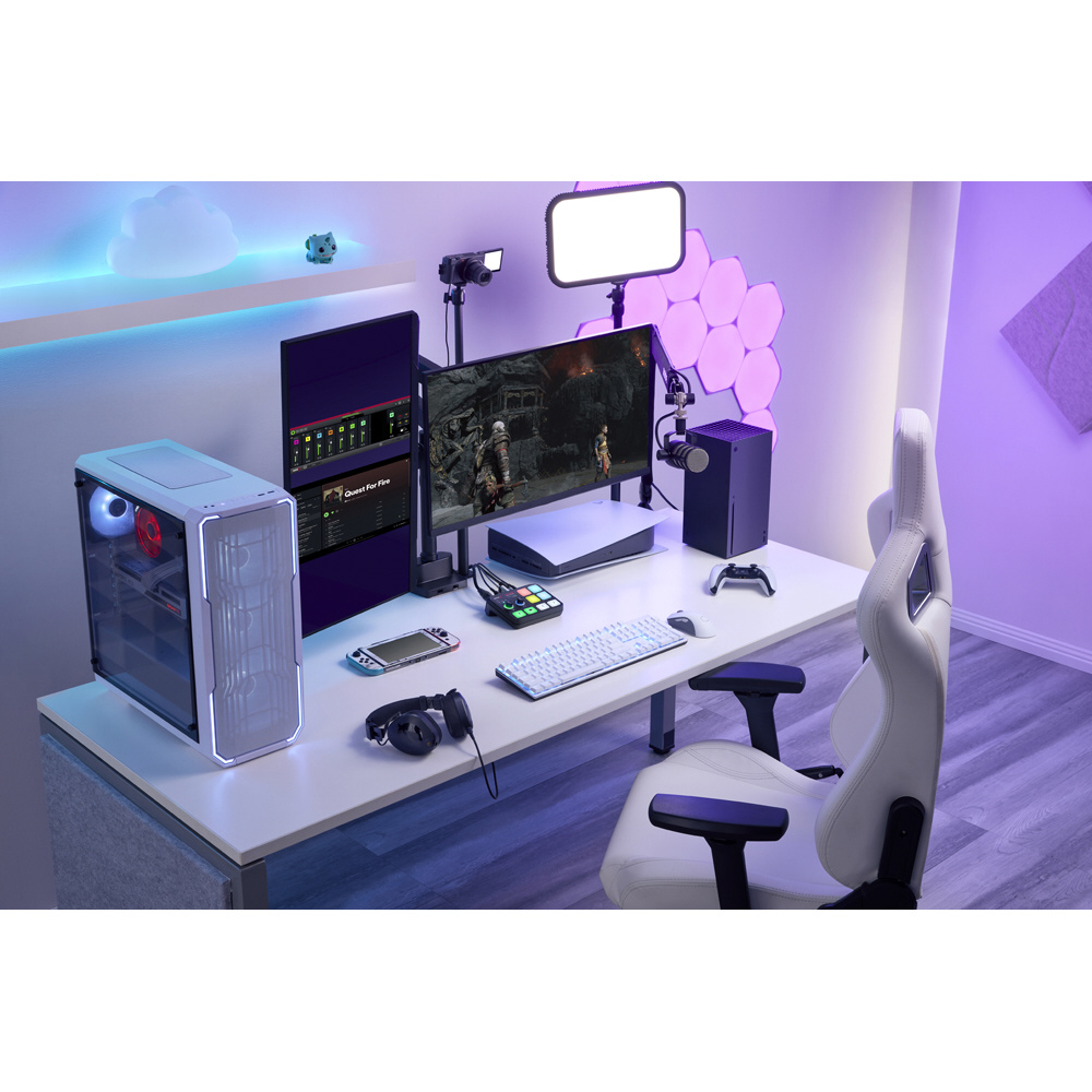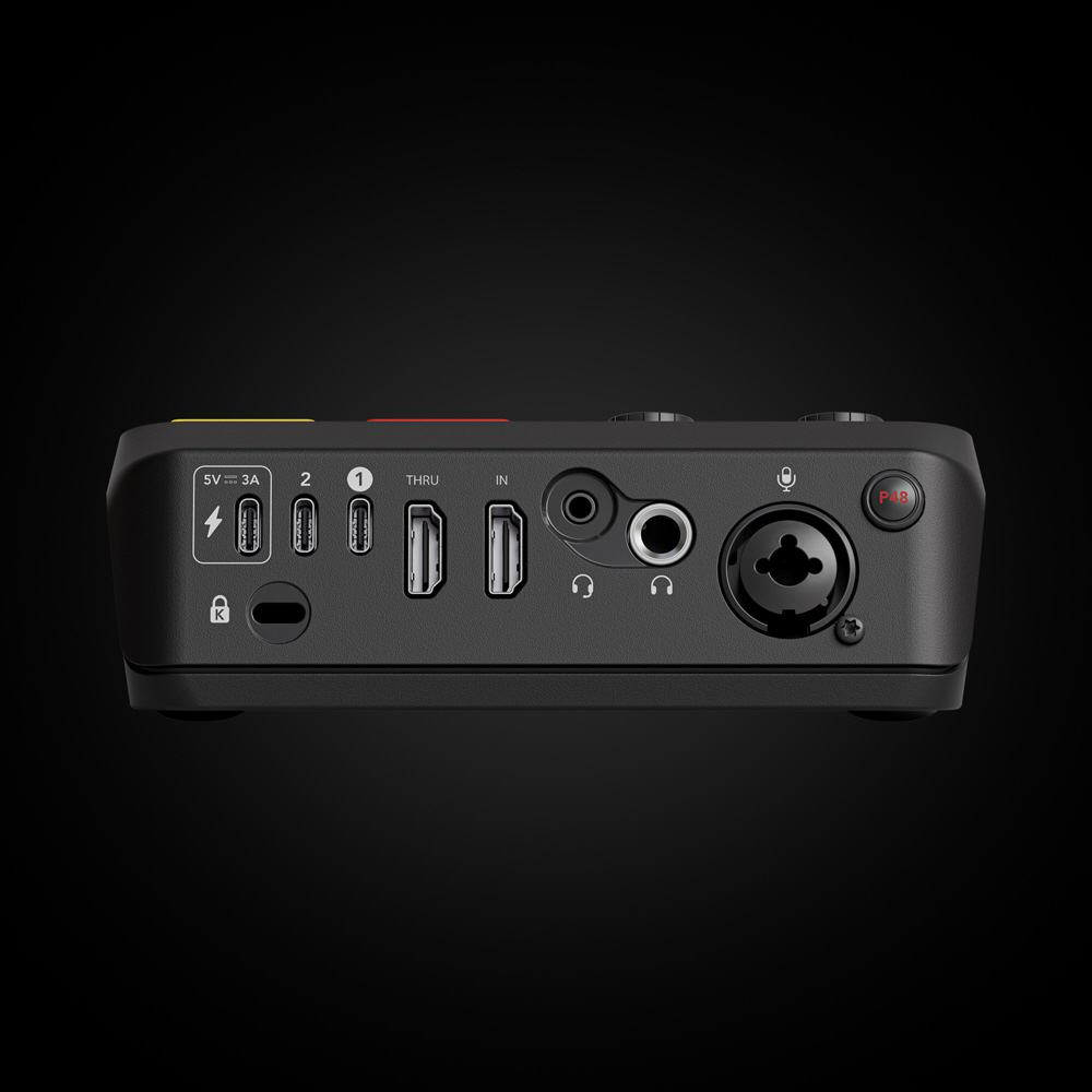 セットアップを邪魔しないコンパクトなサイズにも関わらず、4K 対応キャプチャーボード、高音質オーディオインターフェース、片手で操作可能なコントロールボタンを搭載しています。
