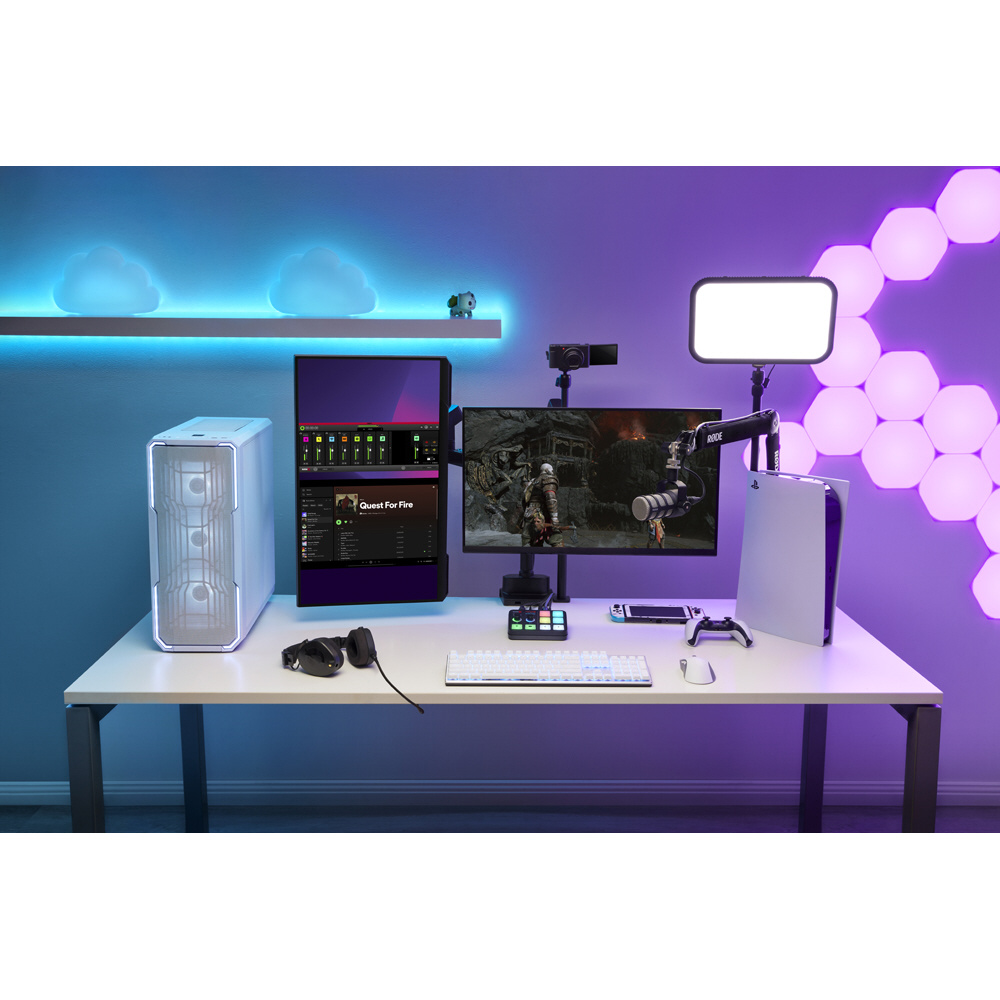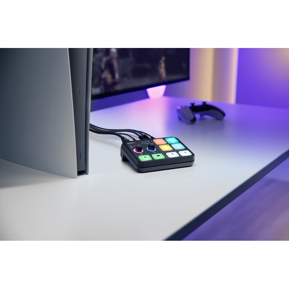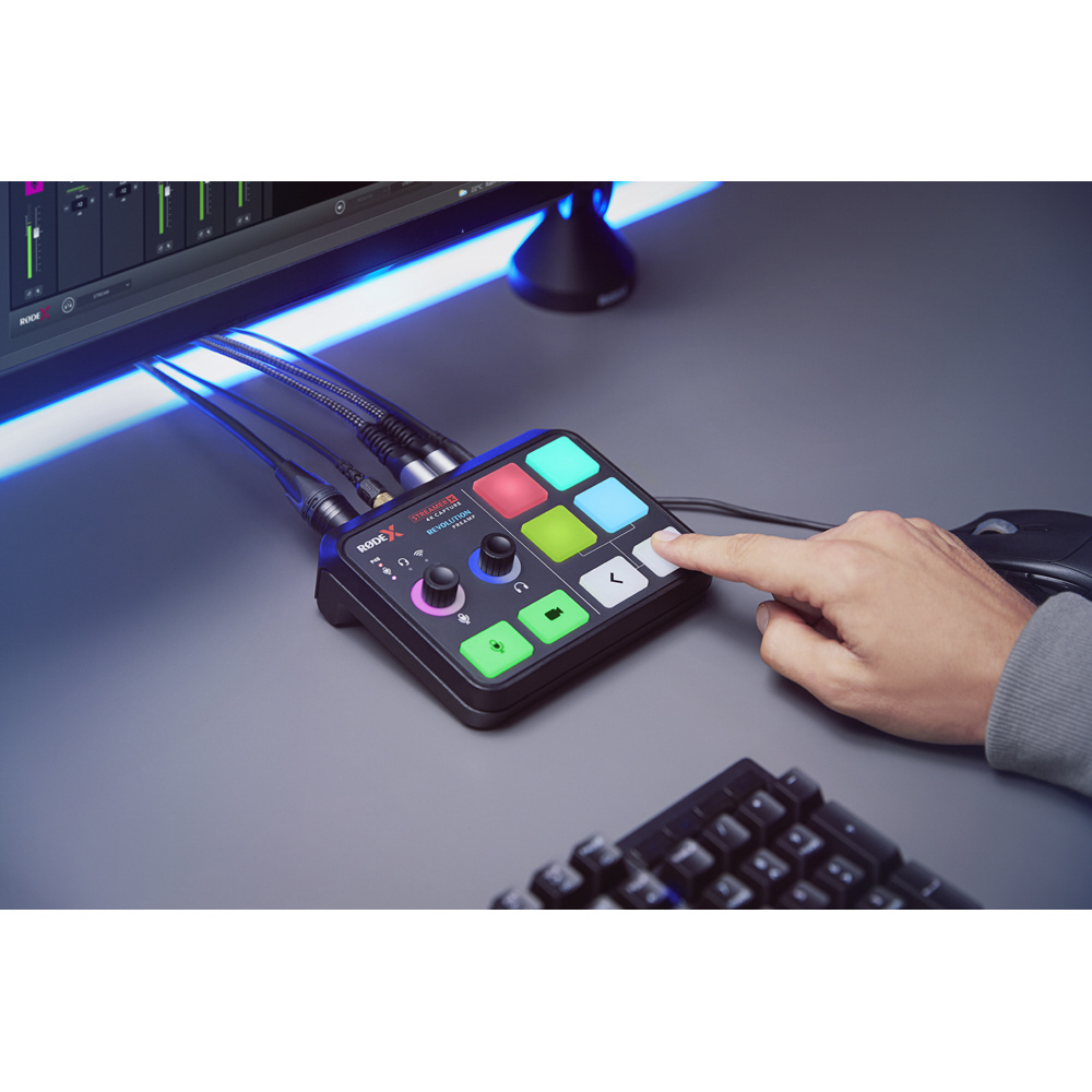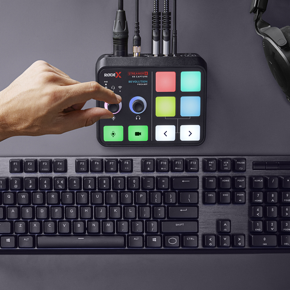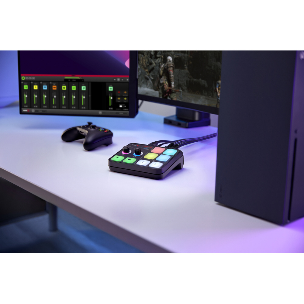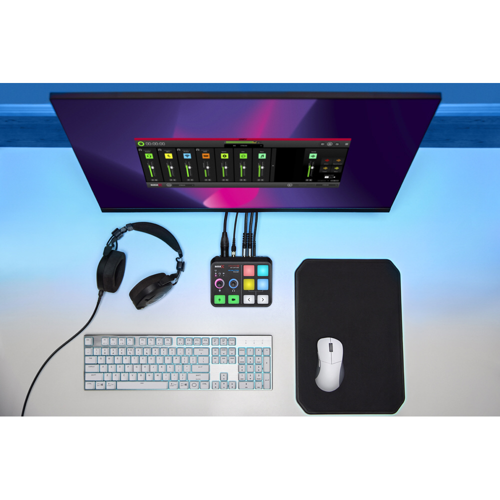 セットアップを邪魔しないコンパクトなサイズにも関わらず、4K 対応キャプチャーボード、高音質オーディオインターフェース、片手で操作可能なコントロールボタンを搭載しています。