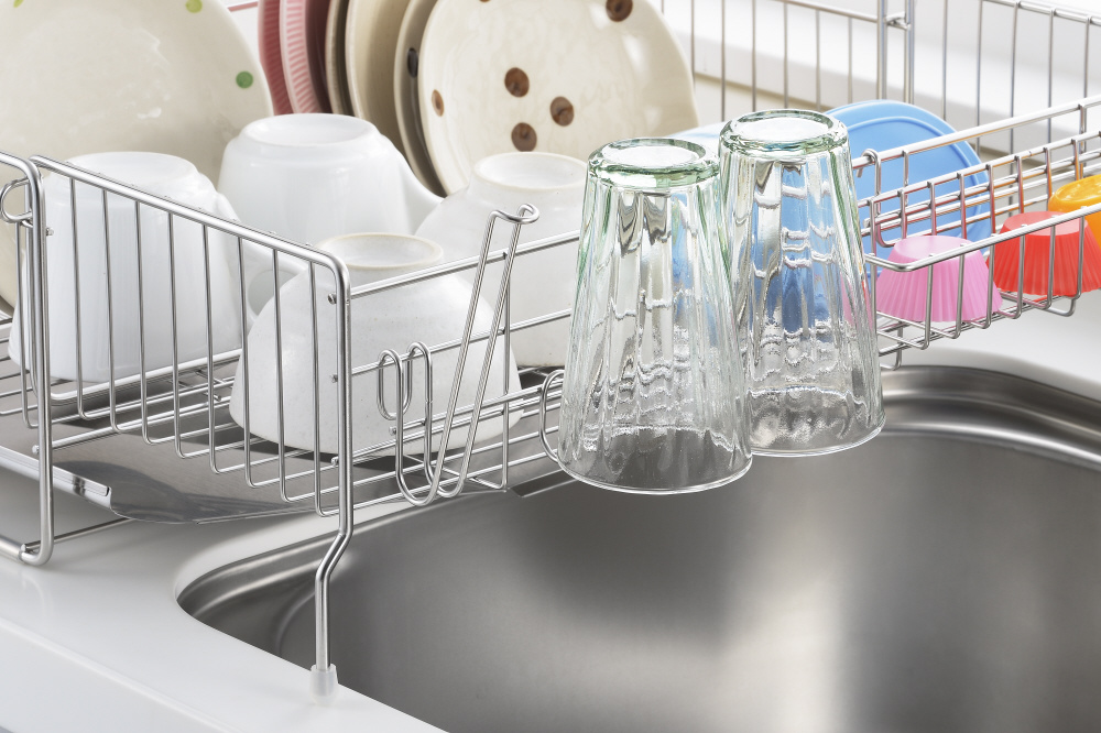 水切りカゴに引っ掛けるだけで簡単に設置でき、グラスをカゴの外で水切りできるので、お皿を置くスペースを確保できます。