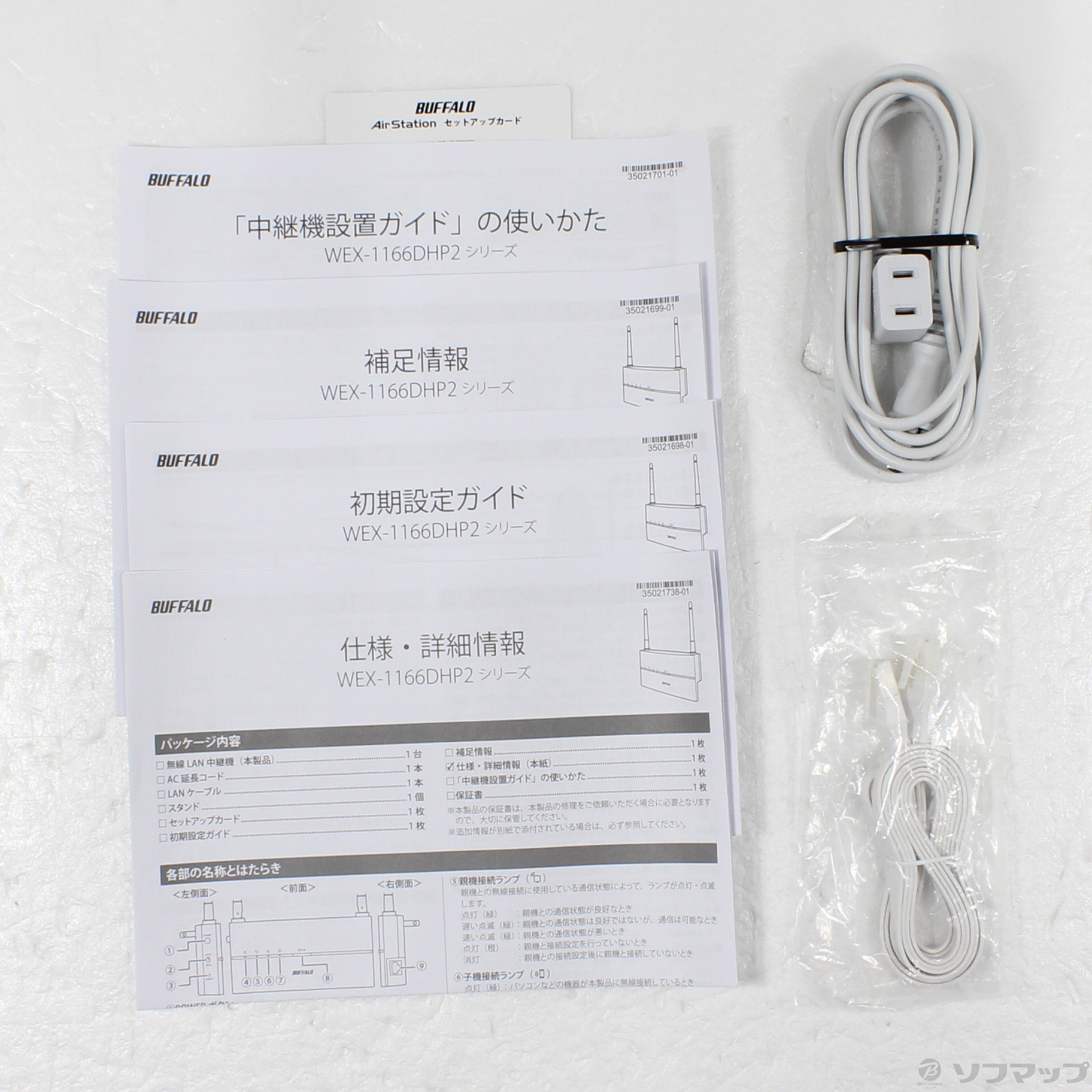 中古商品ランクについて 付属品・商品状態について 〔付属品〕初期設定ガイド、補足情報、仕様・詳細情報、「中継器設置ガイド」の使いかた、スタンド、セットアップカード、AC延長コード、LANケーブル