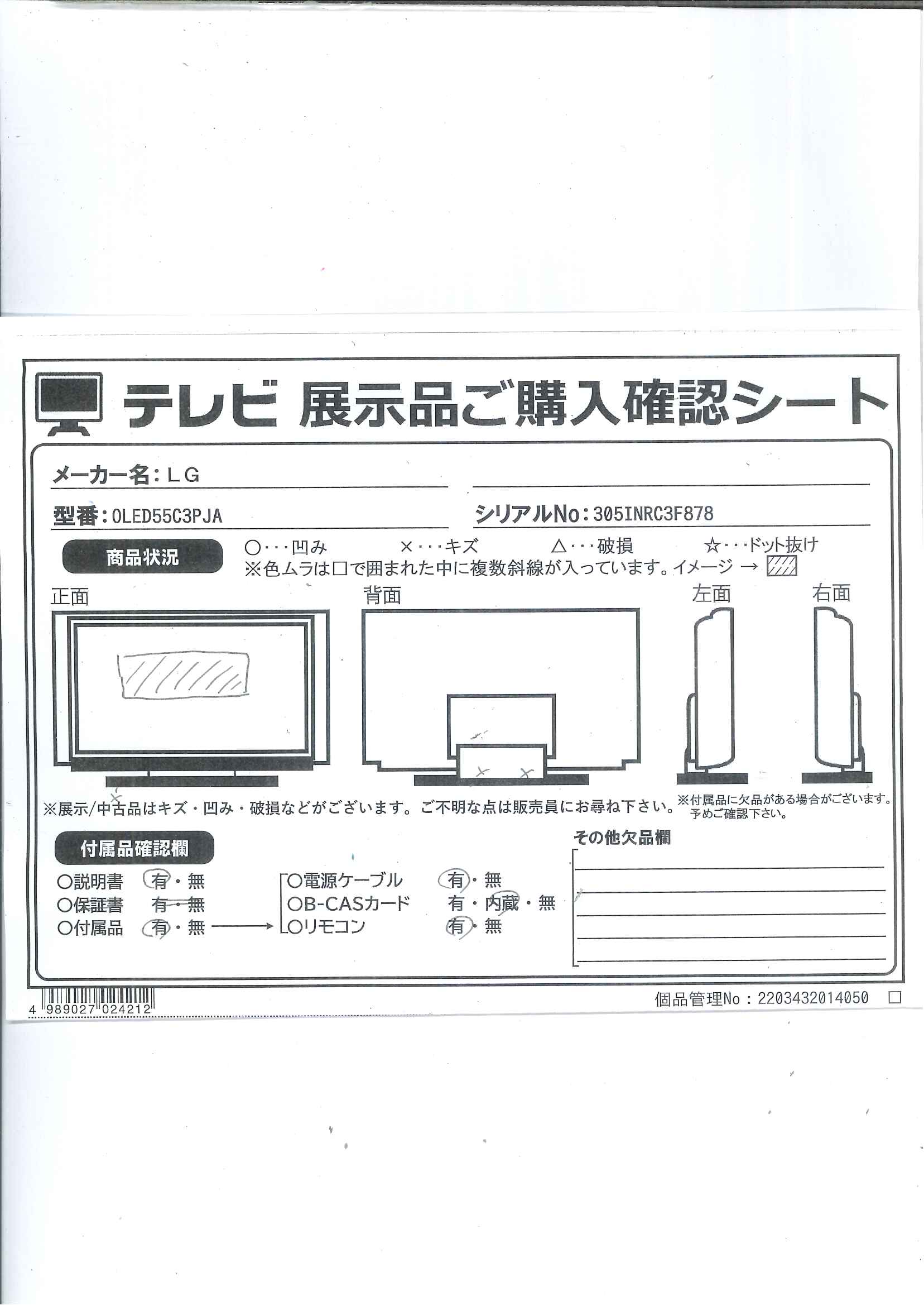 〔中古品(難あり)〕 有機ELテレビ OLED55C3PJA [55V型 /Bluetooth対応 /4K対応 /BS・CS 4Kチューナー内蔵 /YouTube対応]