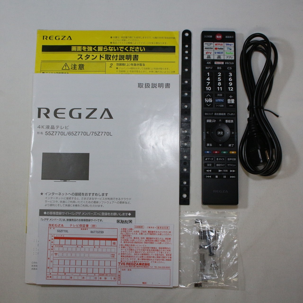 中古商品ランクについて 付属品・商品状態について 〔付属品〕説明書、リモコン、電源コード、転倒防止バンド、ネジ(短)、ネジ(長)、スタンド一式、「レグザ メンバーズ」の登録チラシ、背面カバー