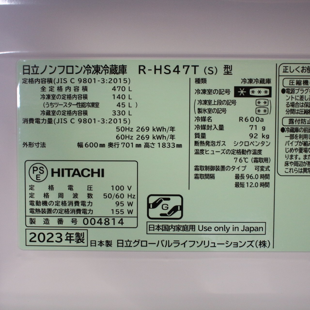 〔中古品〕 冷蔵庫 HSタイプ シルバー R-HS47T-S [幅60cm /470L /5ドア /右開きタイプ /2023年]