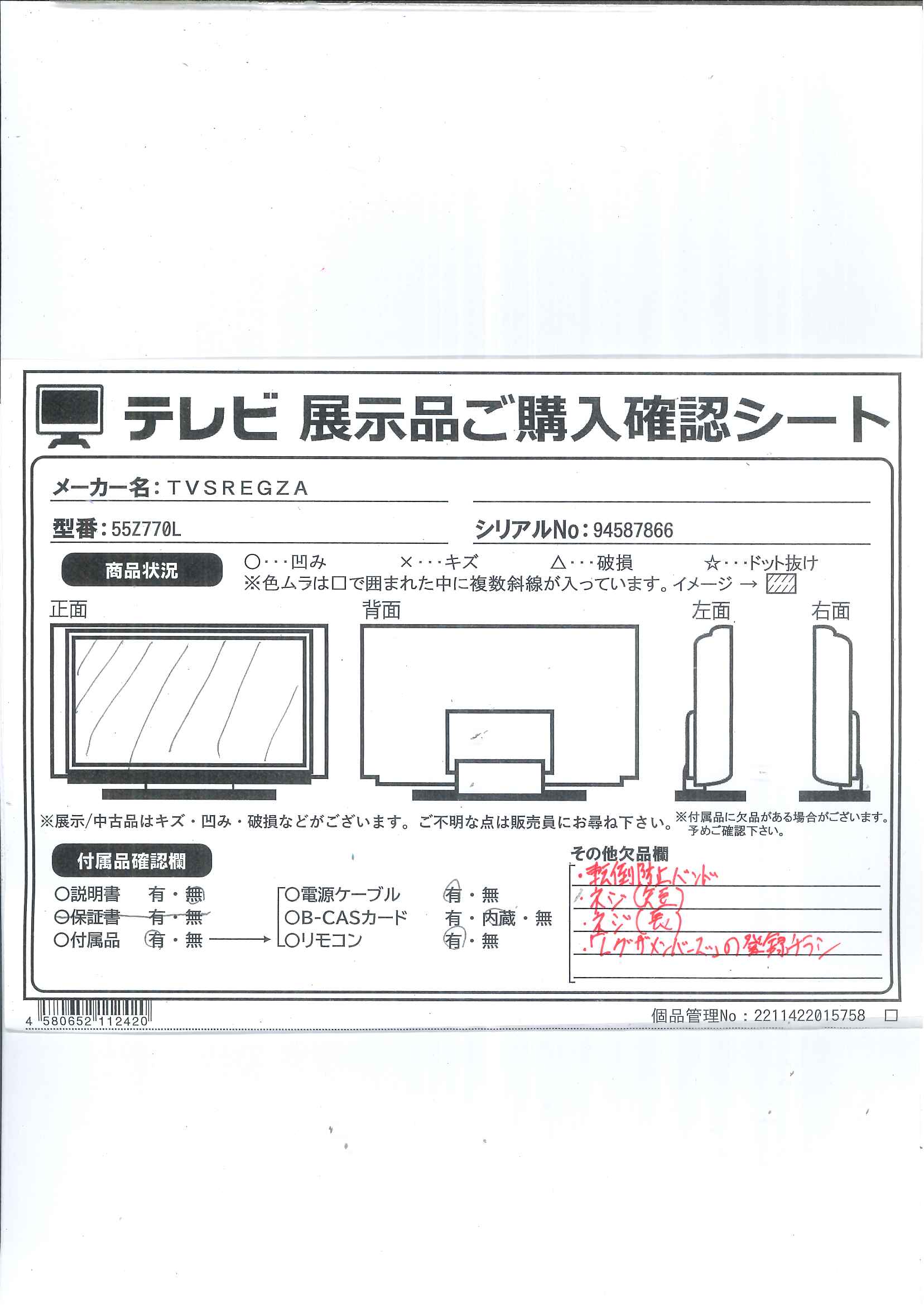 中古商品ランクについて 付属品・商品状態について 〔備考〕液晶:焼き付きあり(5cm四方以内)。