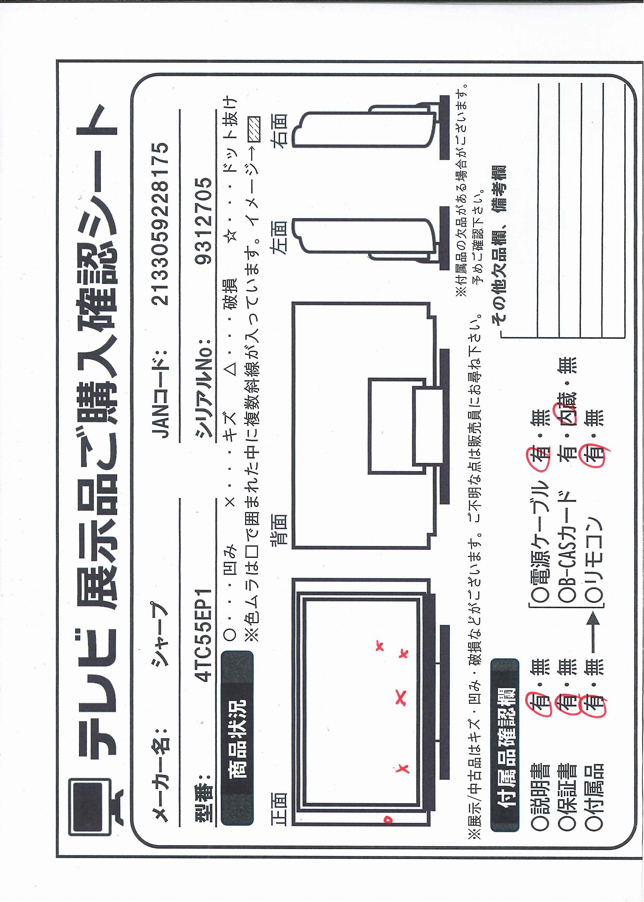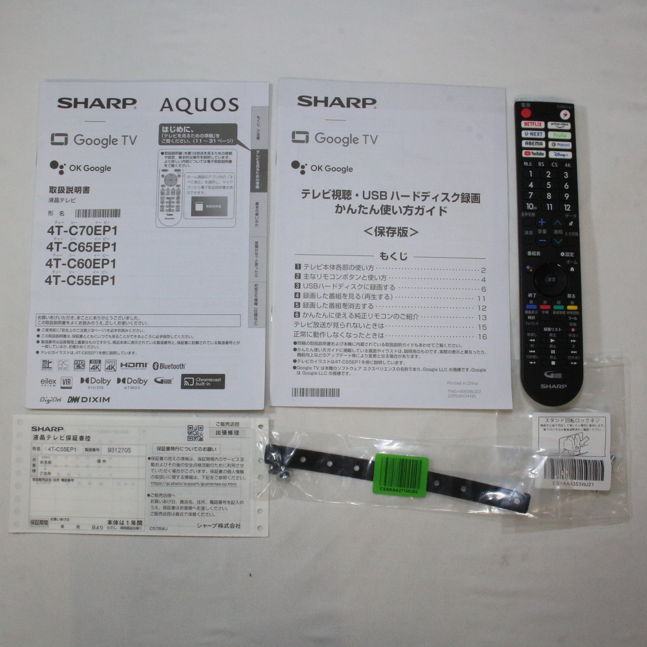 中古商品ランクについて 付属品・商品状態について 〔付属品〕説明書、リモコン、スタンド取付金具、スタンドカバー、スタンドベース、スタンド組立用ネジ×4、スタンド取付用ネジ×4、転倒防止ベルト、転倒防止ベルトテレビ台固定用ネジ、転倒防止ベルトテレビ取付用ネジ、スタンド回転ロックネジ、かんたん使い方ガイド