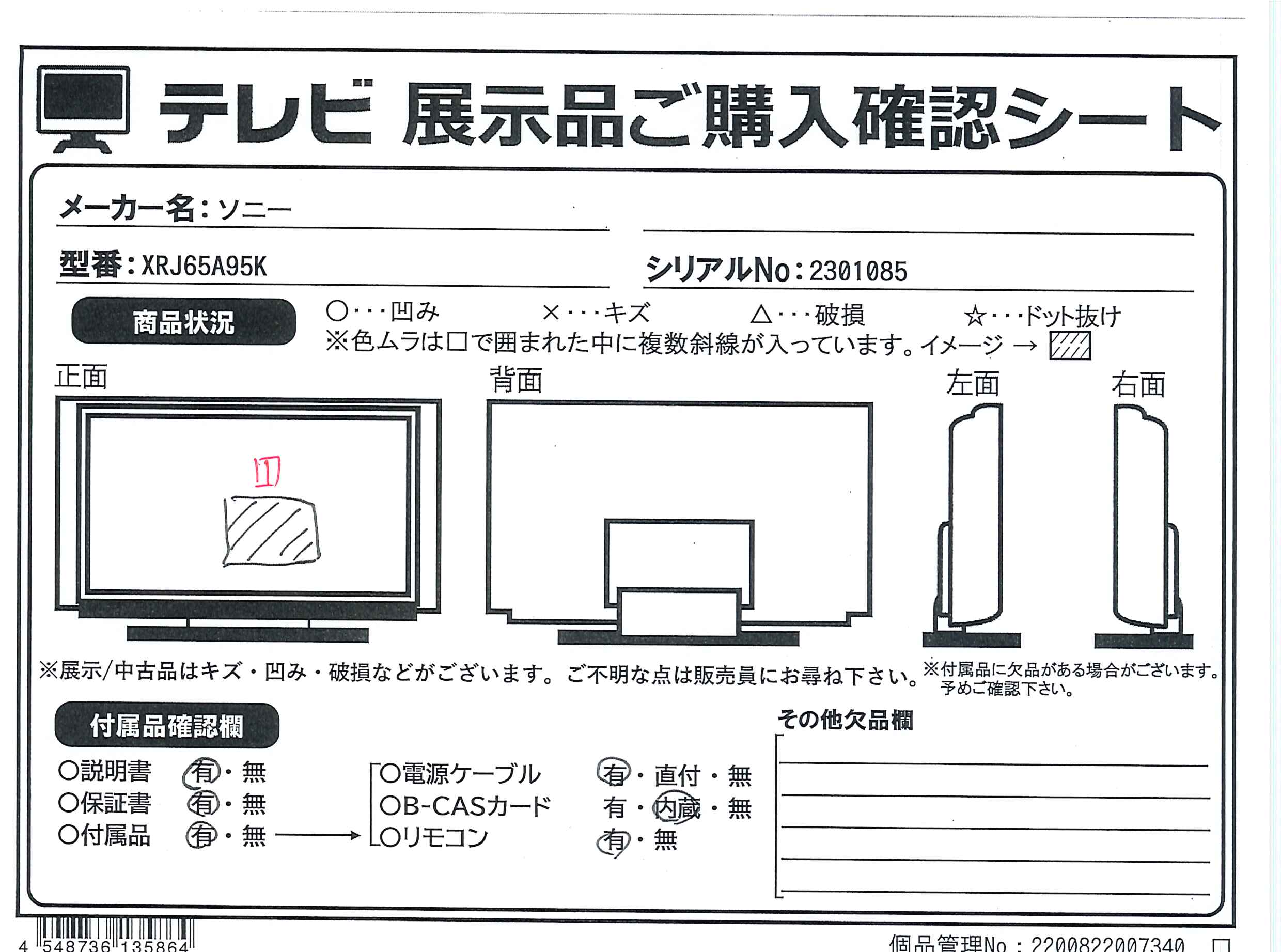 『B-CASカード(赤色)』 の付属については、付属品欄 および 展示品ご購入確認シート(画像)にてご確認ください。