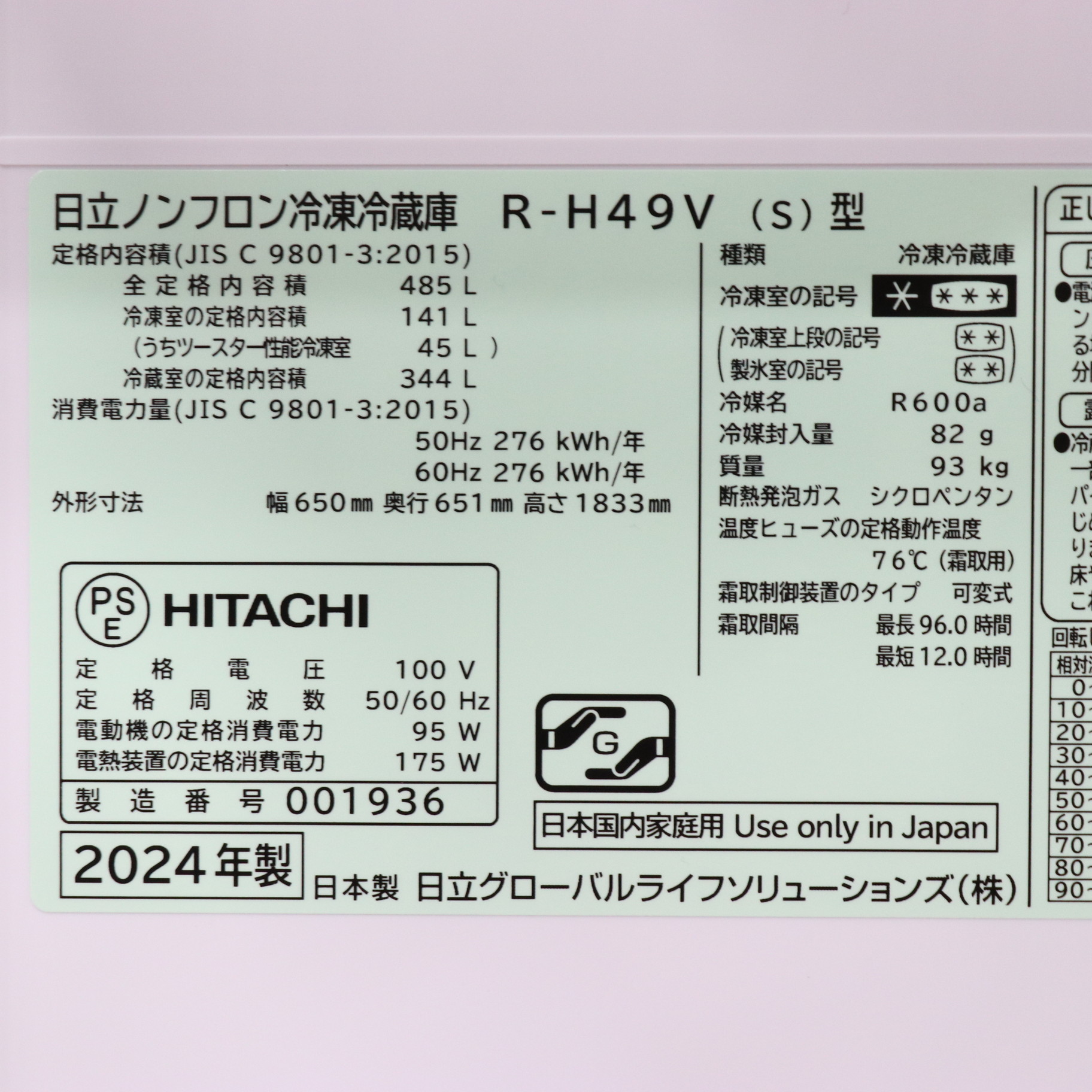 〔展示品〕 冷蔵庫 Hタイプ シルバー R-H49V-S [幅65cm /485L /6ドア /観音開きタイプ /2024年]