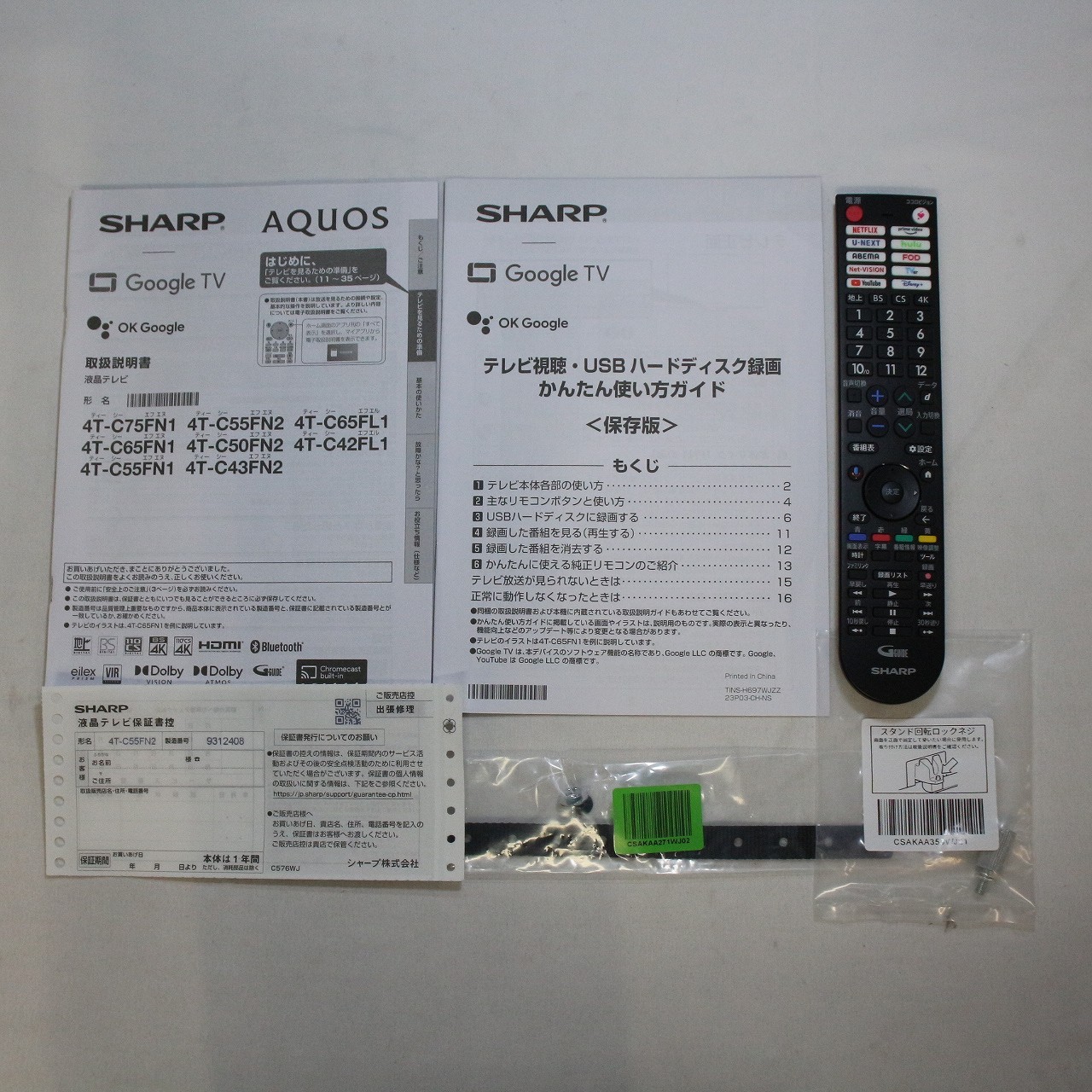 中古商品ランクについて 付属品・商品状態について 〔付属品〕説明書、リモコン、スタンドベース、スタンド取付金具、スタンドカバー、スタンド組立用ネジ×4、スタンド取付用ネジ×4、スタンドカバー取付用ネジ×1、転倒防止ベルト、転倒防止ベルトテレビ取付用ネジ×1、転倒防止ベルトテレビ台固定用ねじ×1、スタンド回転ロックネジ、かんたん使い方ガイド