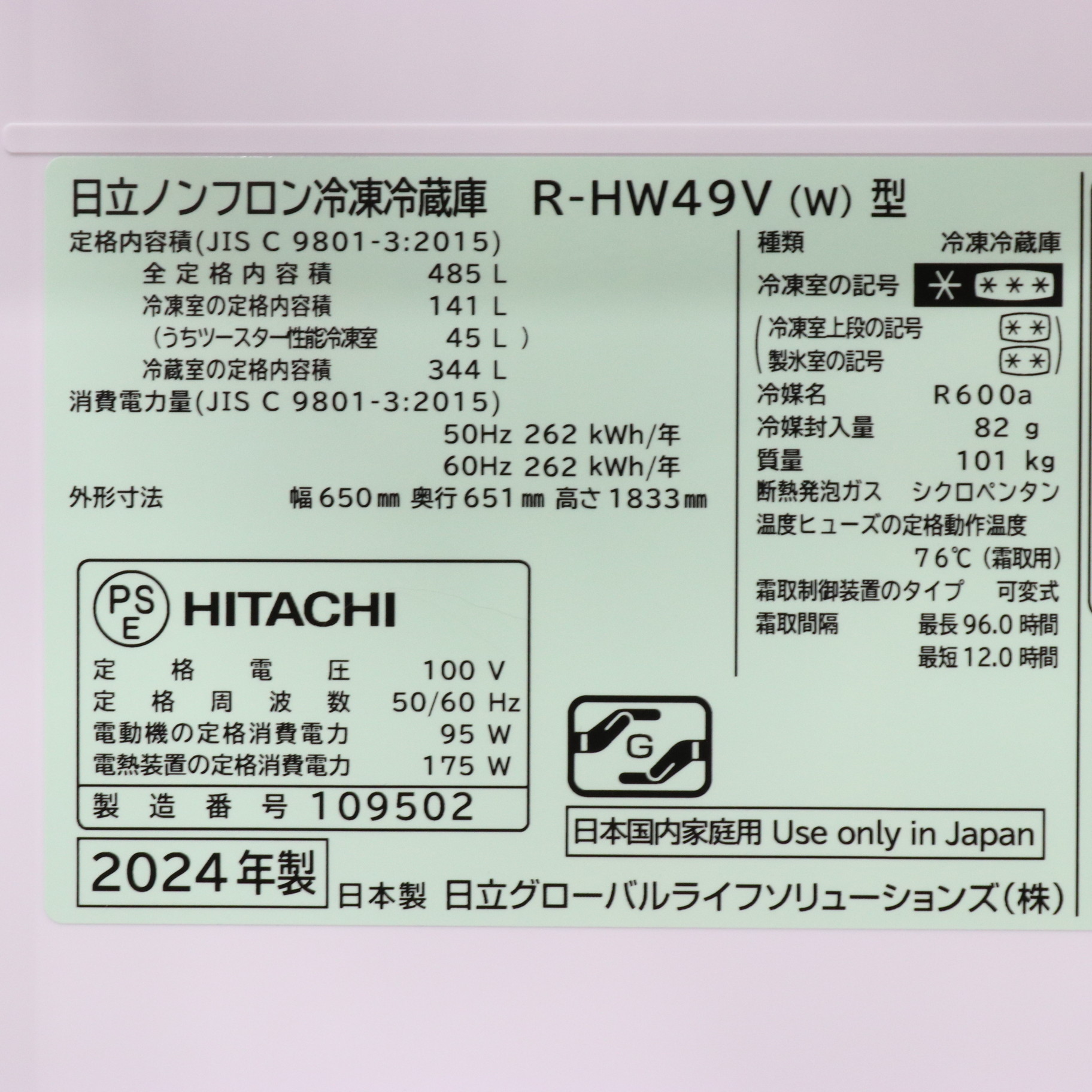 〔中古品〕 冷蔵庫 HWタイプ ピュアホワイト R-HW49V-W [幅65cm /485L /6ドア /観音開きタイプ /2024年]