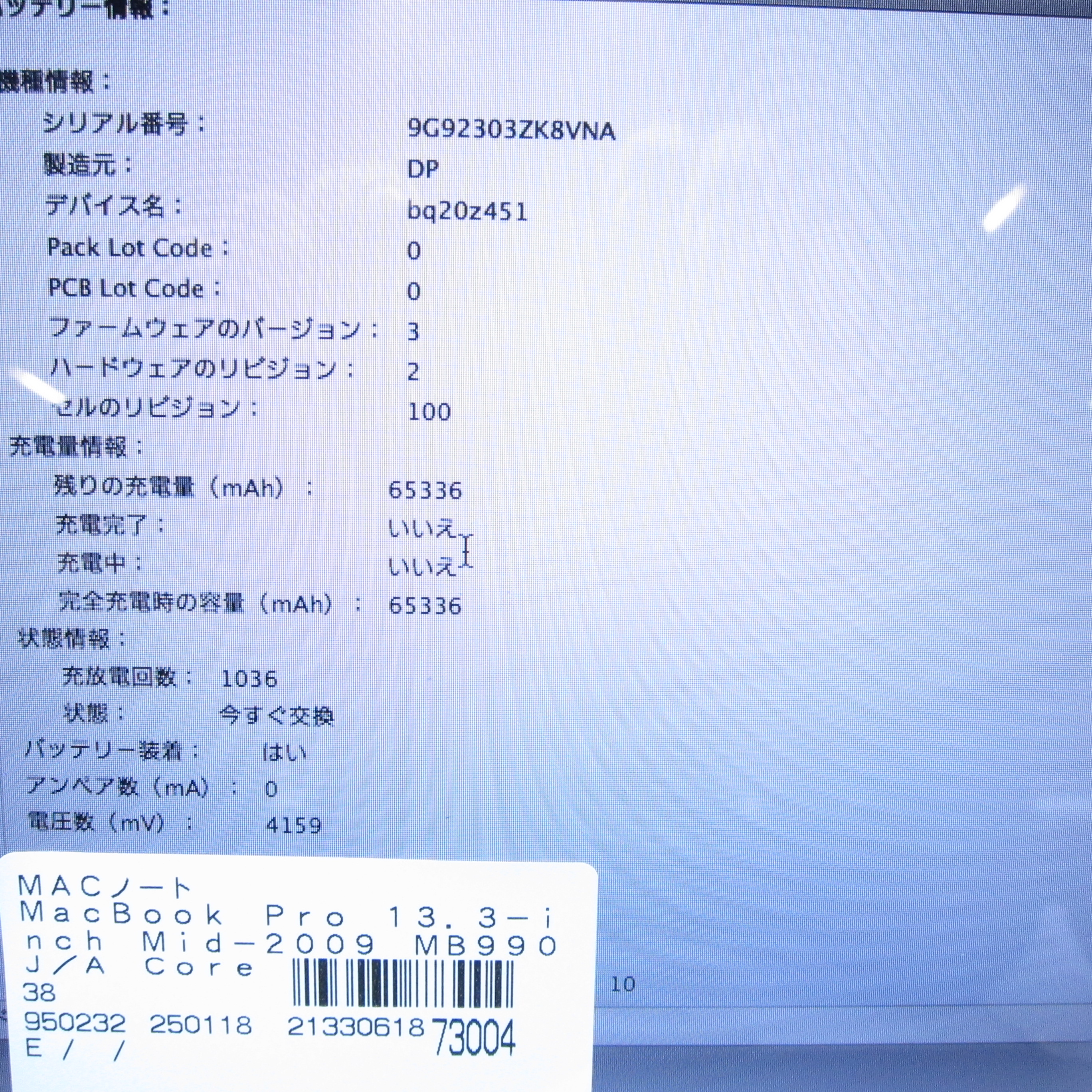 〔中古品(難あり)〕 MacBook Pro 13.3-inch Mid-2009 MB990J/A Core 2 Duo 2.26GHz 4GB HDD160GB 〔OS無し〕 [グラフィック:GeForce 9400M(256MB)/JISキーボード]