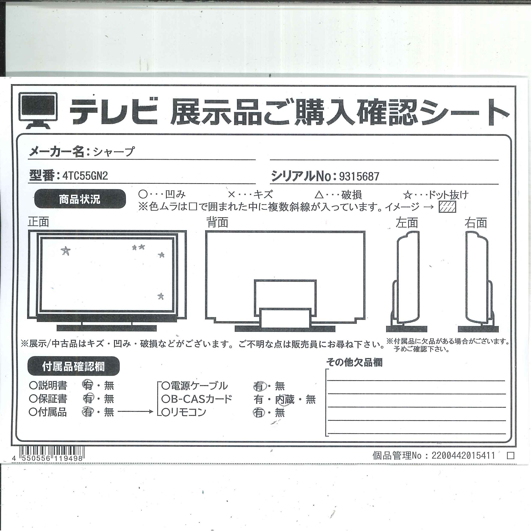 〔中古品〕 液晶テレビ AQUOS ブラック 4T-C55GN2 [55V型 /Bluetooth対応 /4K対応 /BS・CS 4Kチューナー内蔵 /YouTube対応]