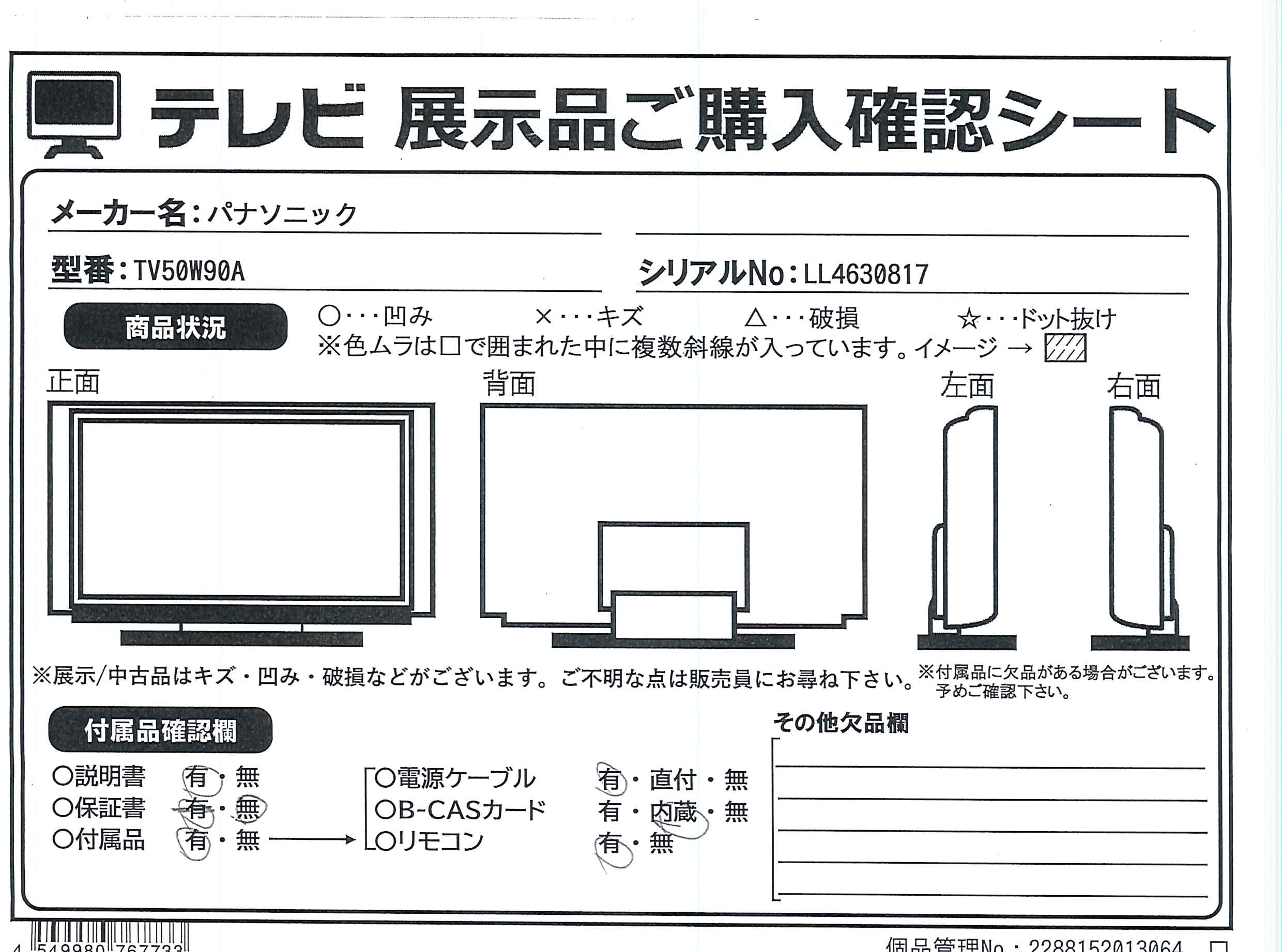 中古商品ランクについて 付属品・商品状態について 〔付属品〕説明書、リモコン、リモコン用乾電池×2、電源コード、スタンド一式、クランパー×2、転倒・落下防止部品一式