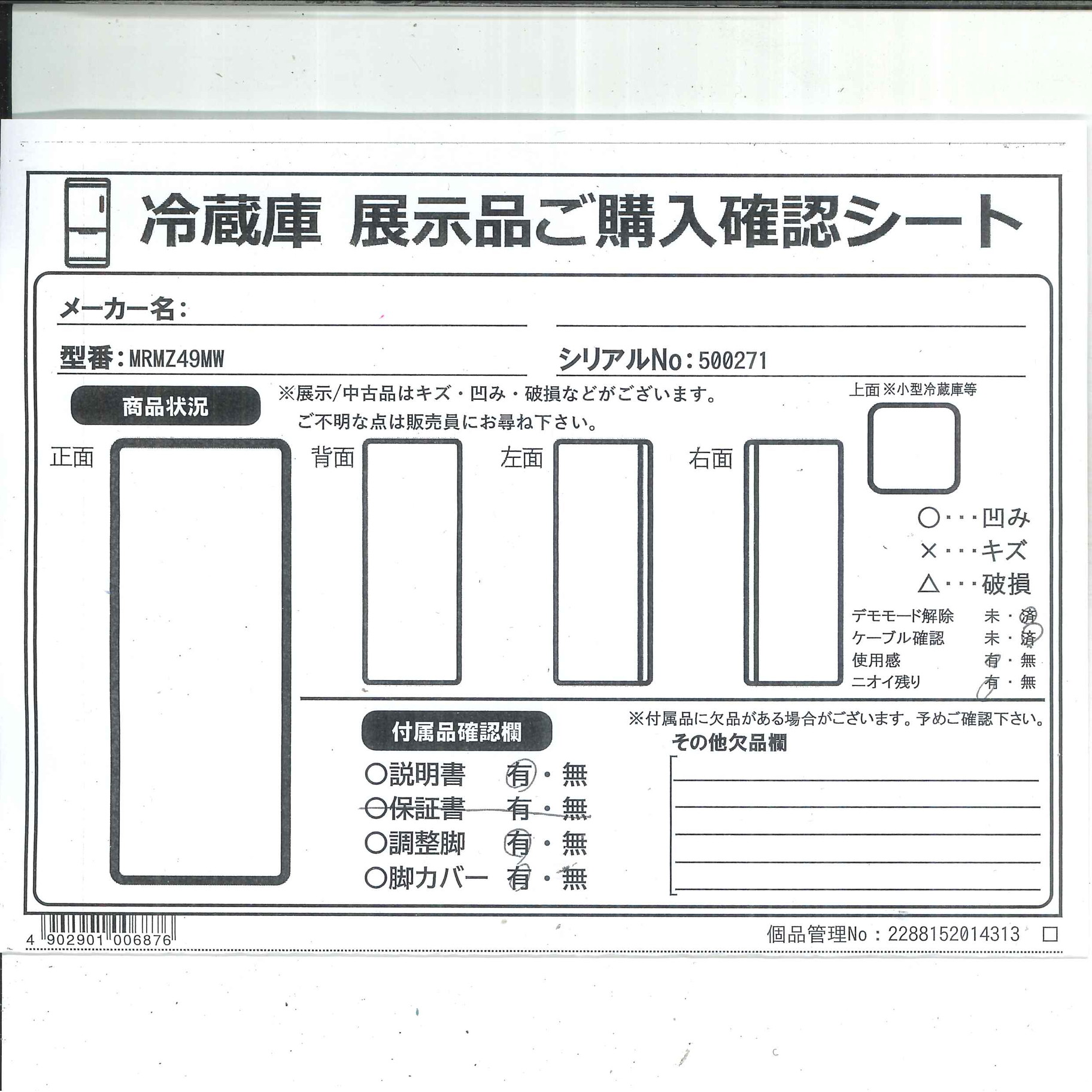 〔中古品〕 冷蔵庫 中だけひろびろ大容量 MZシリーズ(プレミアムフレンチモデル) グランドリネンホワイト MR-MZ49M-W [幅65cm /485L /6ドア /観音開きタイプ /2024年]