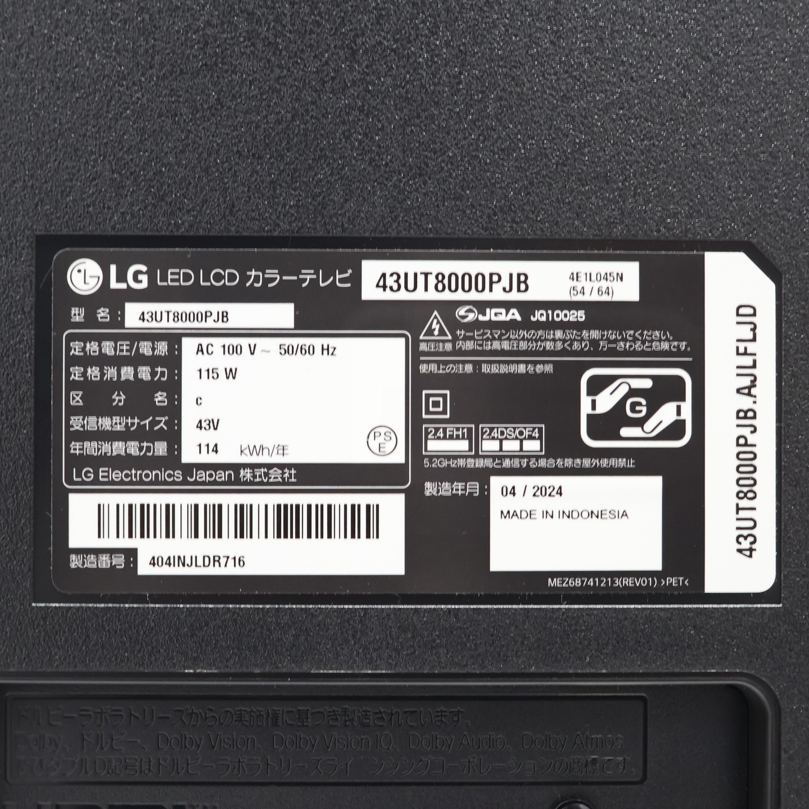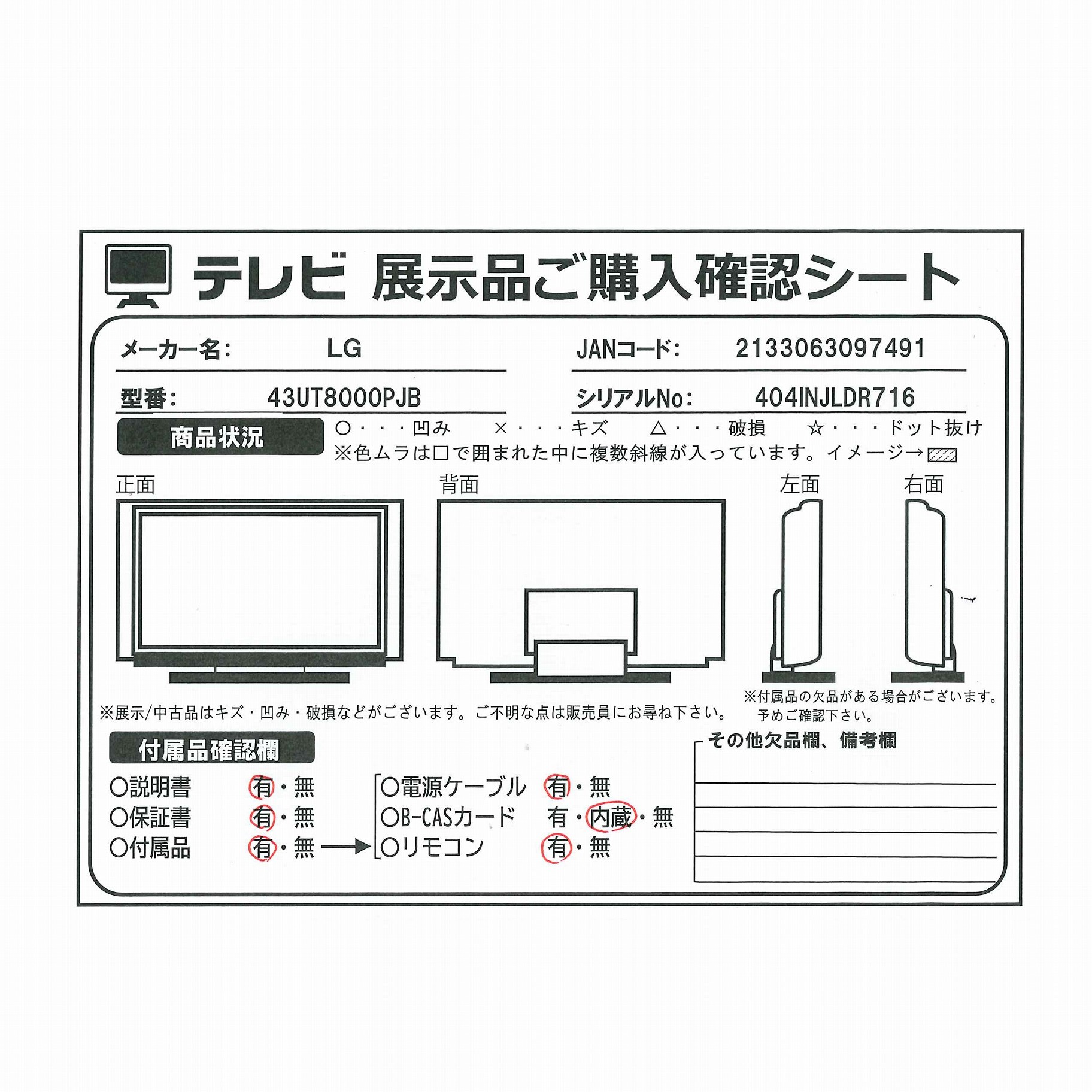 〔展示品〕 液晶テレビ 43UT8000PJB [43V型 /Bluetooth対応 /4K対応 /BS・CS 4Kチューナー内蔵 /YouTube対応]