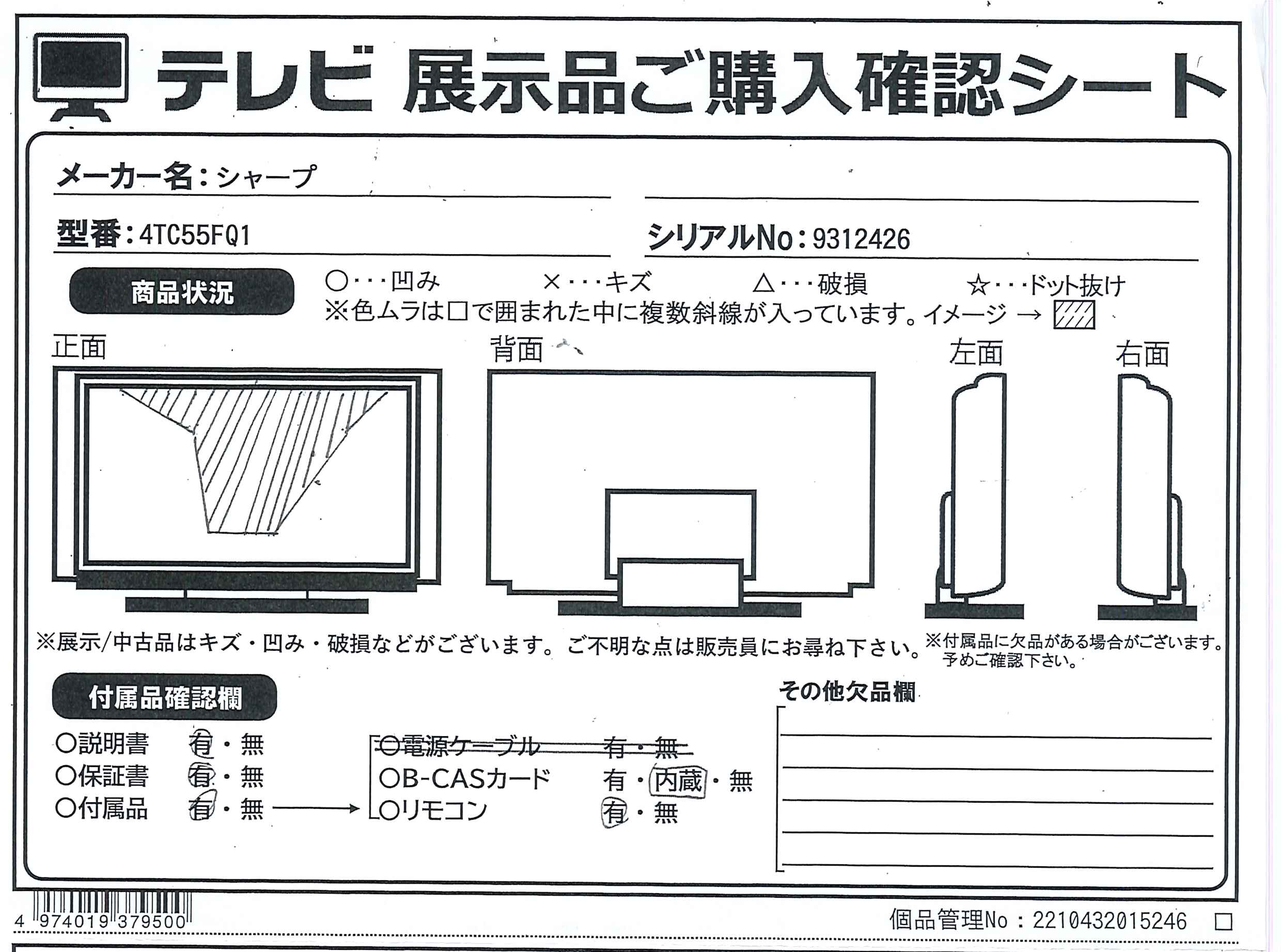 〔展示品〕 有機ELテレビ AQUOS 4T-C55FQ1 [55V型 /Bluetooth対応 /4K対応 /BS・CS 4Kチューナー内蔵 /YouTube対応]