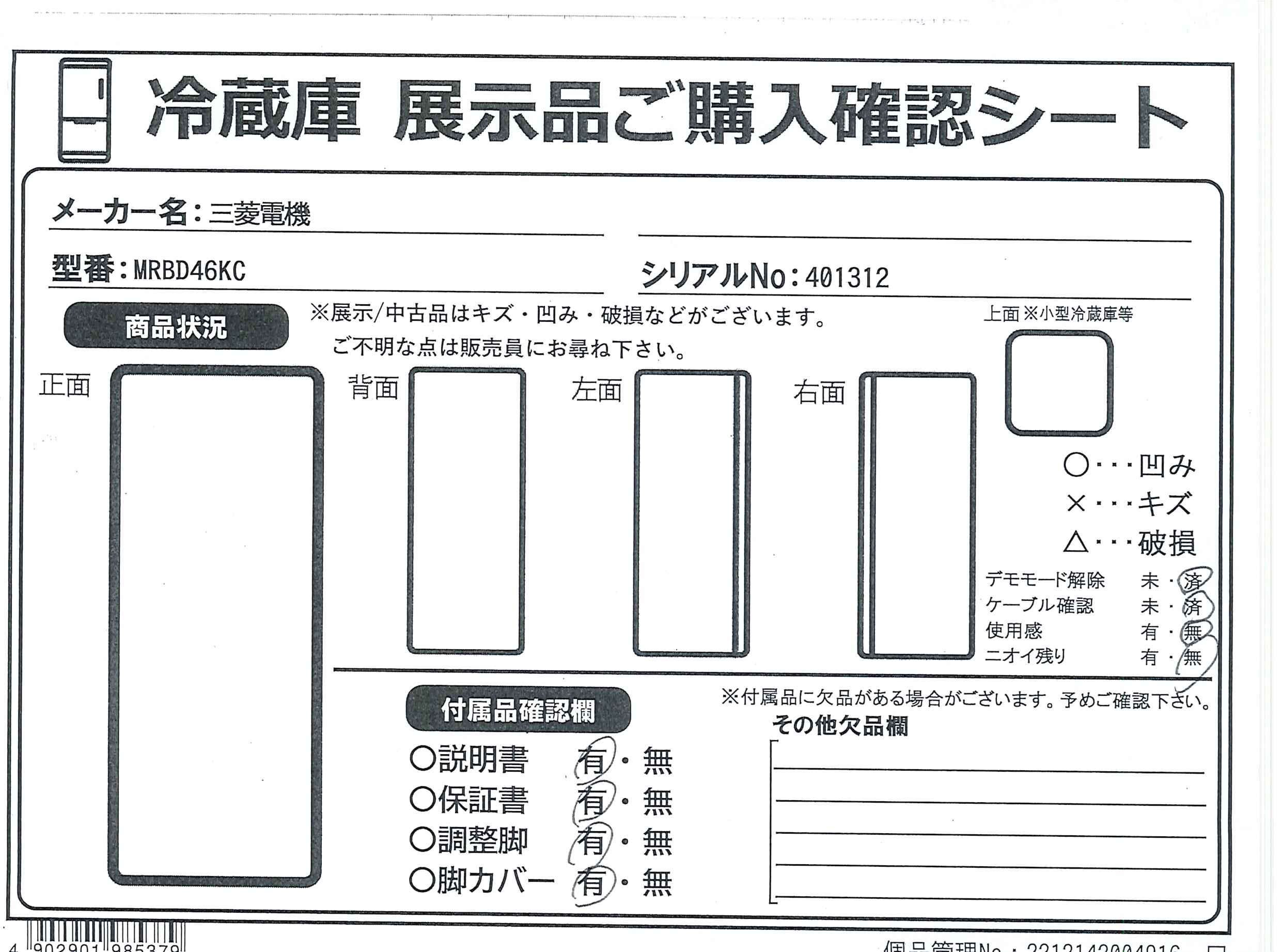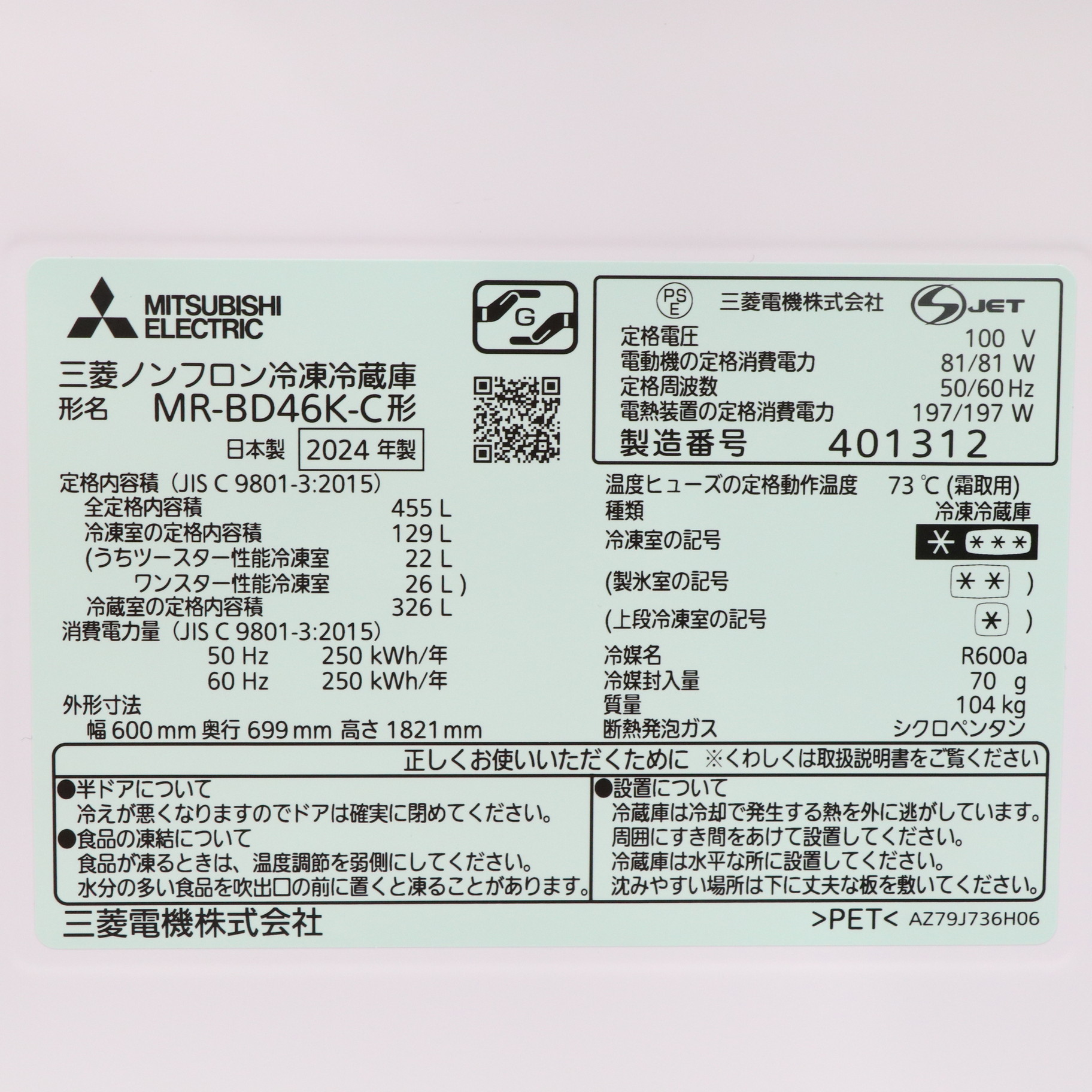 〔展示品〕 冷蔵庫 置けるスマート大容量 BDシリーズ グレイングレージュ MR-BD46K-C [幅60cm /455L /5ドア /右開きタイプ /2024年]