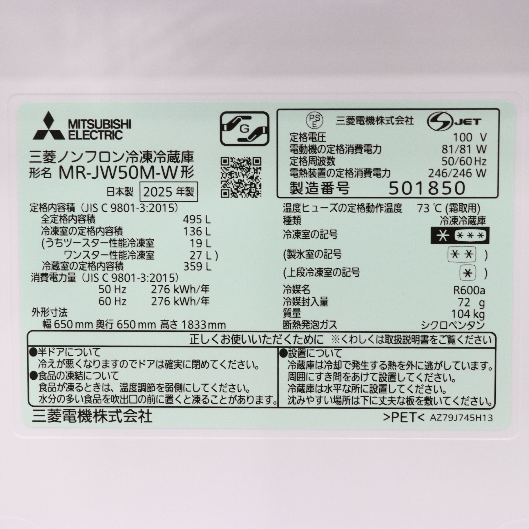 〔中古品〕 冷蔵庫 JWシリーズ シルクホワイト MR-JW50M-W [幅65cm /495L /6ドア /観音開きタイプ /2025年]