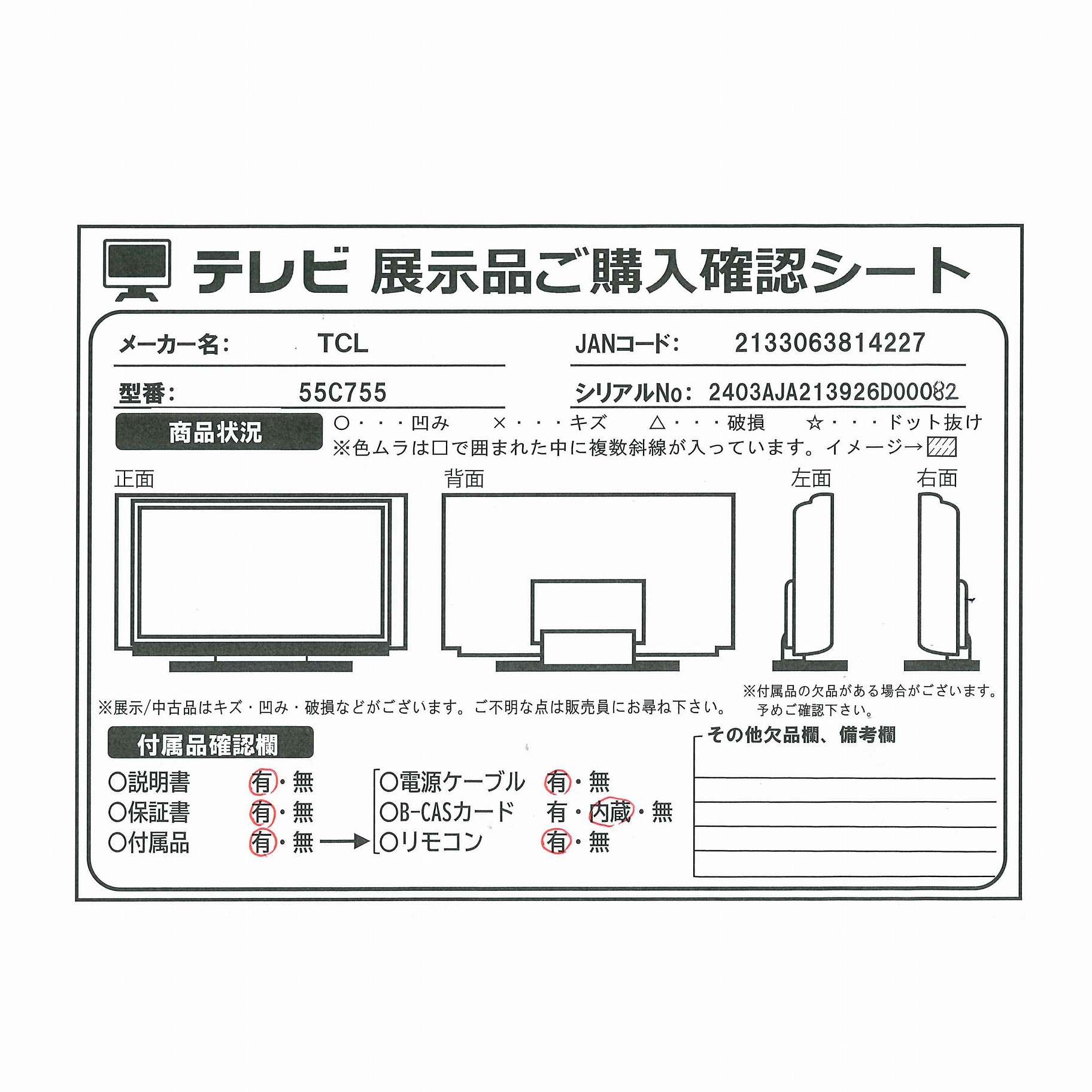 中古商品ランクについて 付属品・商品状態について 〔付属品〕説明書、かんたんガイド、電源コード、スタンドX2、スタンド取付用ネジ×10、VESAネジX2、ネジ(ST4)、クリップX3、VESAネジ(12mm)掛けネジX2、VESAネジ(25mm)掛けネジX2、リモコン