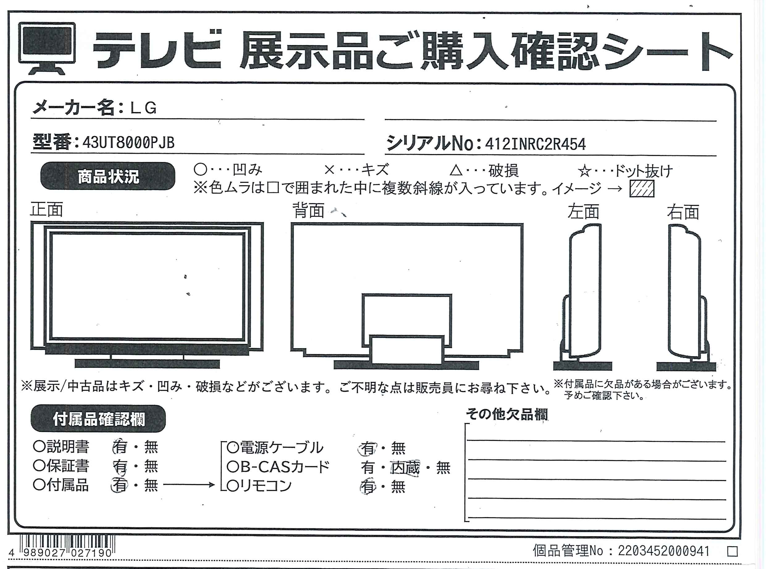 中古商品ランクについて 付属品・商品状態について 〔付属品〕取扱説明書、かんたんガイド、標準リモコン、単4形乾電池×2、電源コード、スタンド(A)、スタンド(B)、スタンド固定用ネジ(M4×16mm)×2、ケーブルホルダー×2、ケーブルホルダー(電源コード用)、転倒防止バンド、転倒防止バンド取付用ネジ(M4×10mm)、転倒防止固定用ネジ(M4×20mm)
