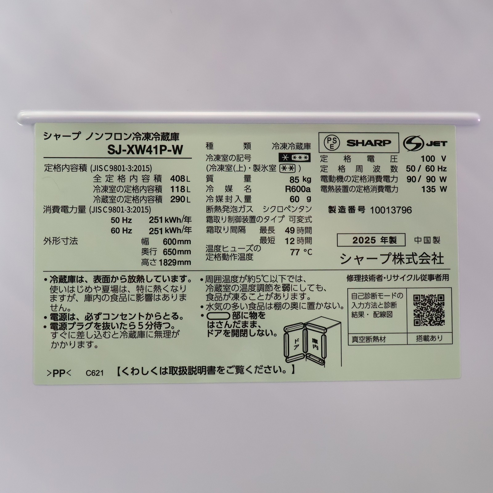 〔展示品〕 両開き408L冷蔵庫 シルキーマットホワイト SJ-XW41P-W [60cm /408L /5ドア /左右開きタイプ]