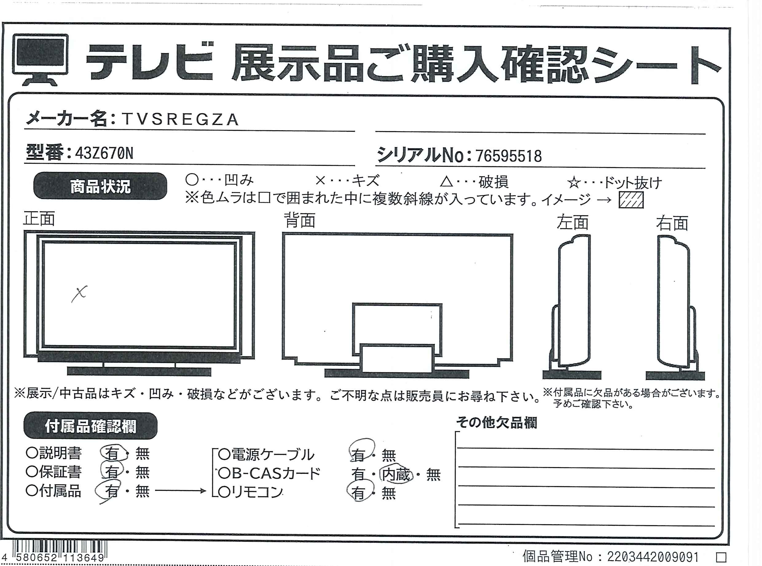 中古商品ランクについて 付属品・商品状態について 〔付属品〕取扱説明書、支柱、高さ調整金具、スタンドベース、スタンド組立・取付ネジ(M5×16mm)×14、リモコン(CT-90505)、単四形乾電池×2、電源コード、転倒防止バンド一式、コードクランプ、背面カバー