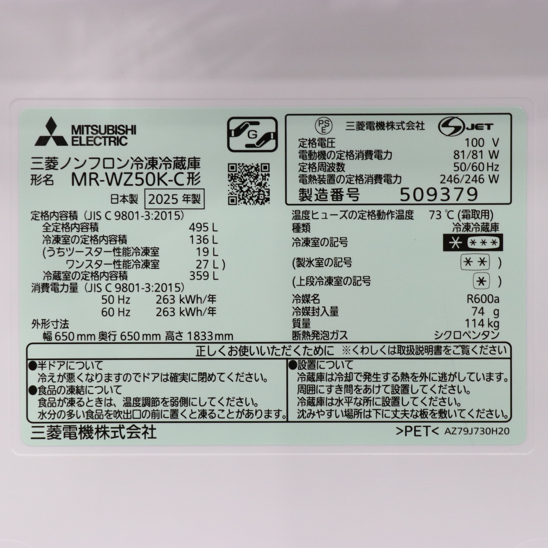〔中古品〕 冷蔵庫 WZシリーズ グランドクレイベージュ MR-WZ50K-C [幅65cm /495L /6ドア /観音開きタイプ /2024年]