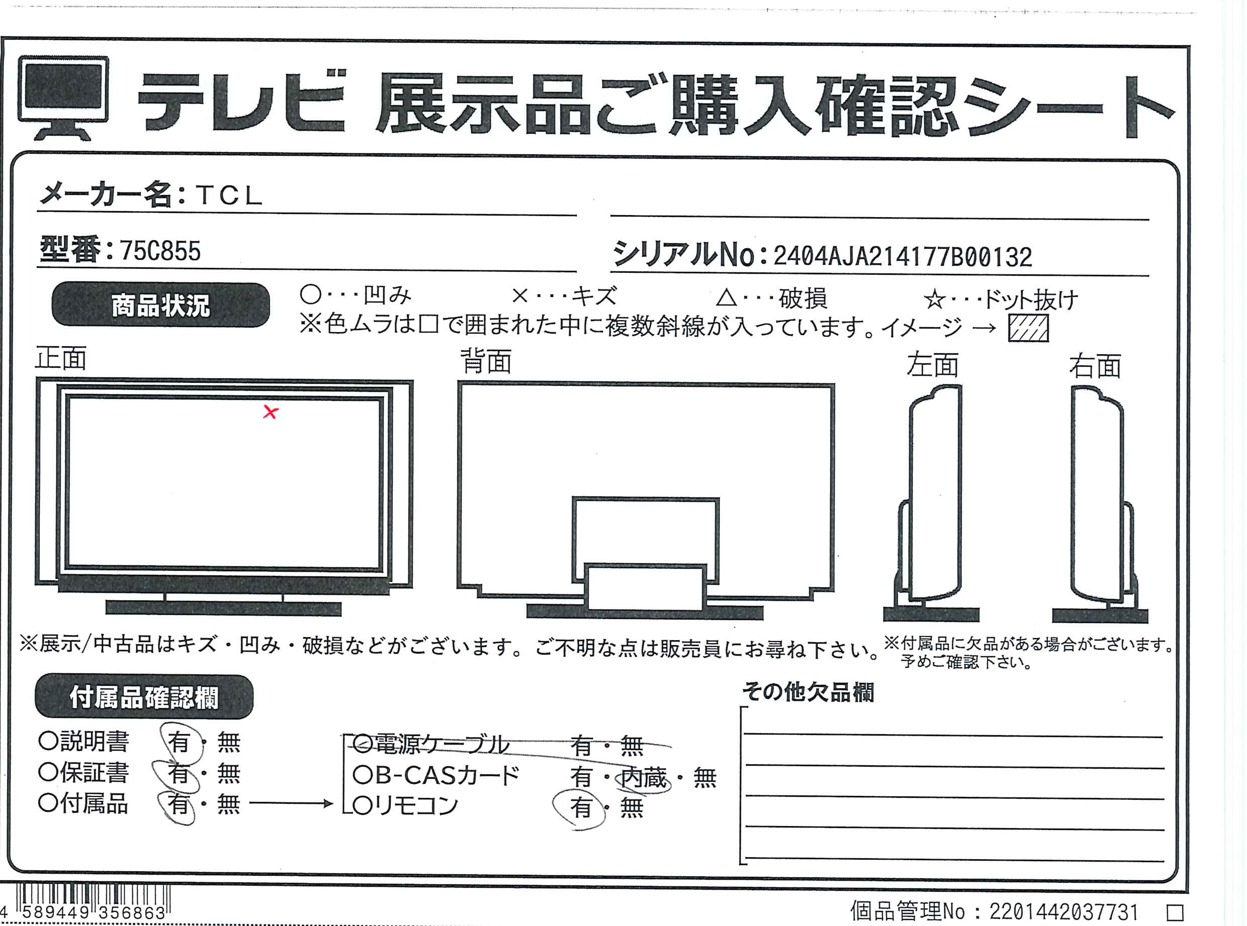 中古商品ランクについて 付属品・商品状態について 〔付属品〕取扱説明書、かんたんガイド、リモコン、単4形乾電池×2、電源コード、スタンド×2、ねじ(M5)×10、VESAネジ×2、ねじ(ST4)、クリップ×3