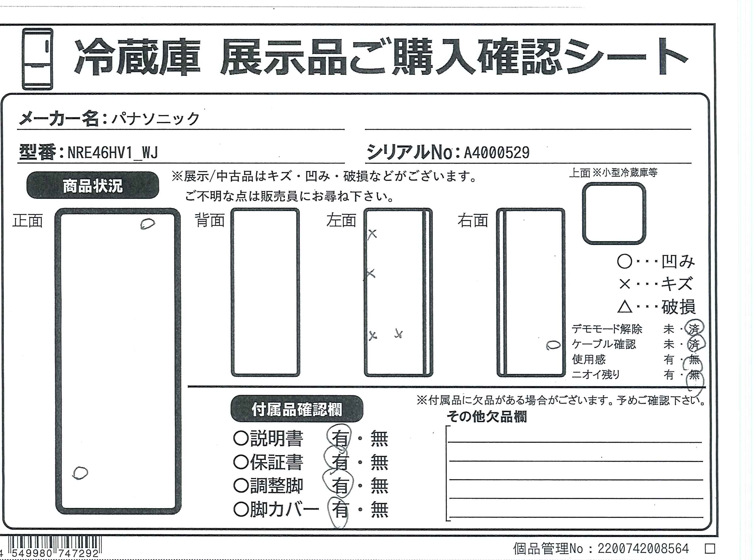 中古商品ランクについて 付属品・商品状態について 〔付属品〕説明書、調節脚×2、脚カバー、給水タンク、浄水フィルター、卵トレイ、アルミトレイ(パーシャル/チルド切替室)、洗える製氷皿、防音マット、アイスシャベル、お掃除らくらくトレイ、アルミプレート(クーリングアシストルーム)、仕切り(冷凍室)、保鮮プレート、うまもりカバー