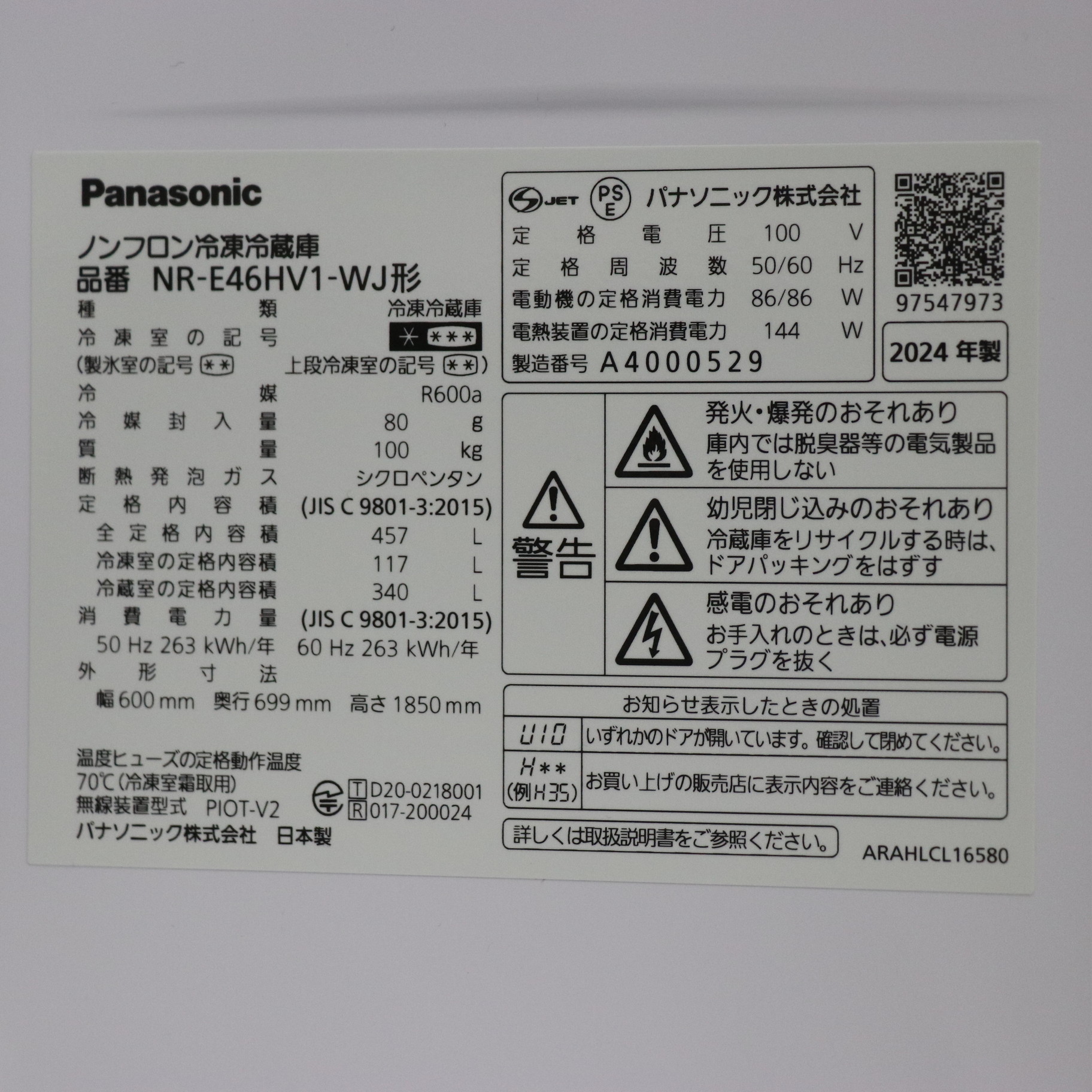 〔展示品〕 冷蔵庫 HVタイプ セラミックオフホワイト NR-E46HV1-WJ [60 /457 /5ドア /右開きタイプ /2024年]