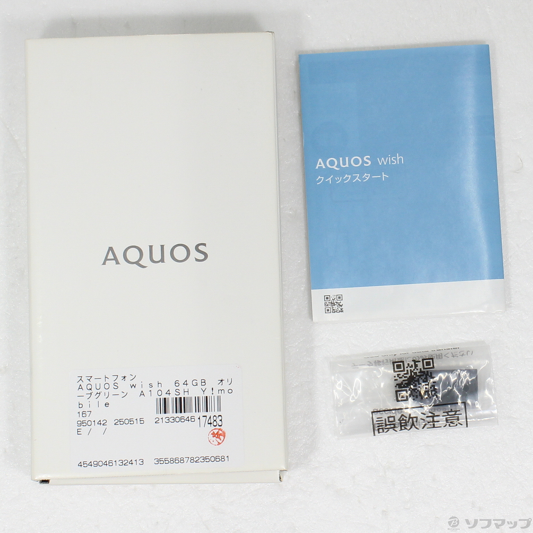 〔中古品〕 AQUOS wish 64GB オリーブグリーン A104SH Y!mobile SIMフリー [5.7インチ液晶/Snapdragon 480 5G]