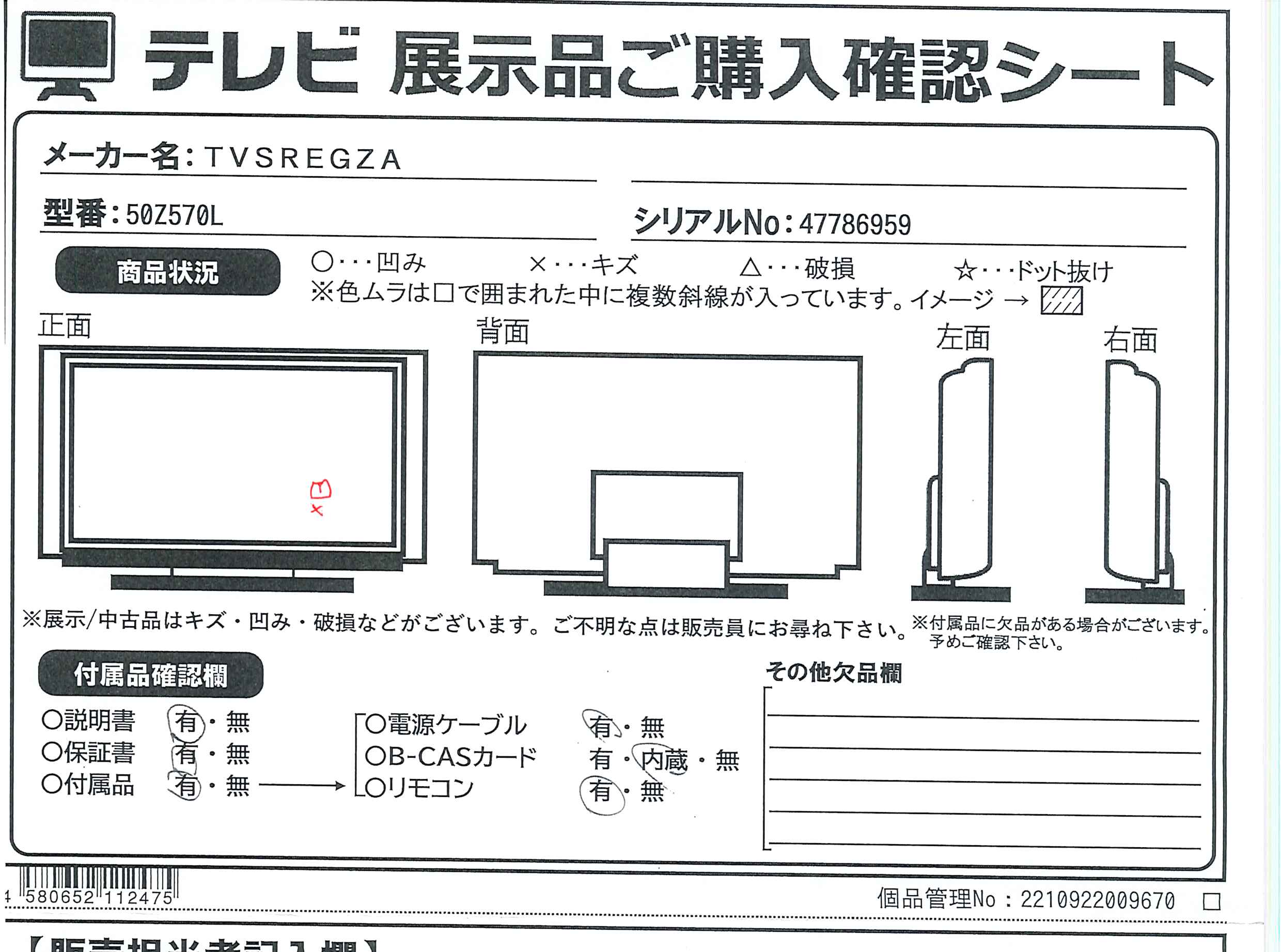 中古商品ランクについて 付属品・商品状態について 〔付属品〕取扱説明書、「レグザ メンバーズ」の登録チラシ、スタンド一式、リモコン、単四型乾電池×2、電源コード、転倒防止バンド一式、スタンド取付説明書