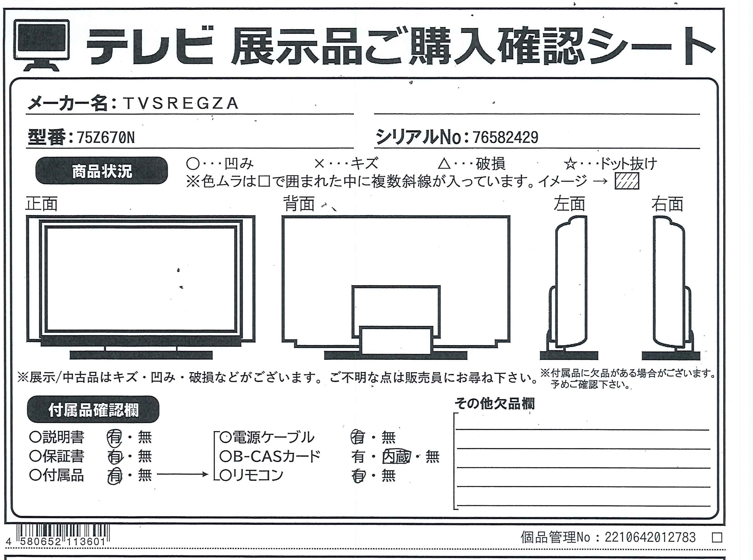 〔展示品〕 液晶テレビ REGZA(レグザ) 75Z670N [75V型 /Bluetooth対応 /4K対応 /BS・CS 4Kチューナー内蔵 /YouTube対応]