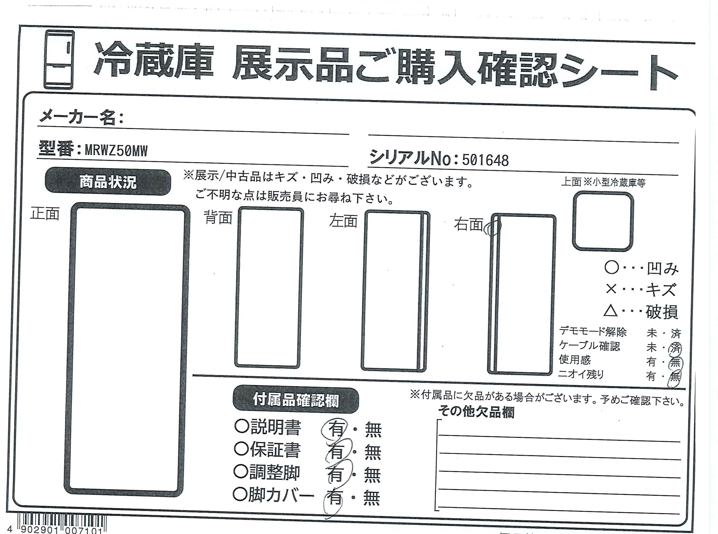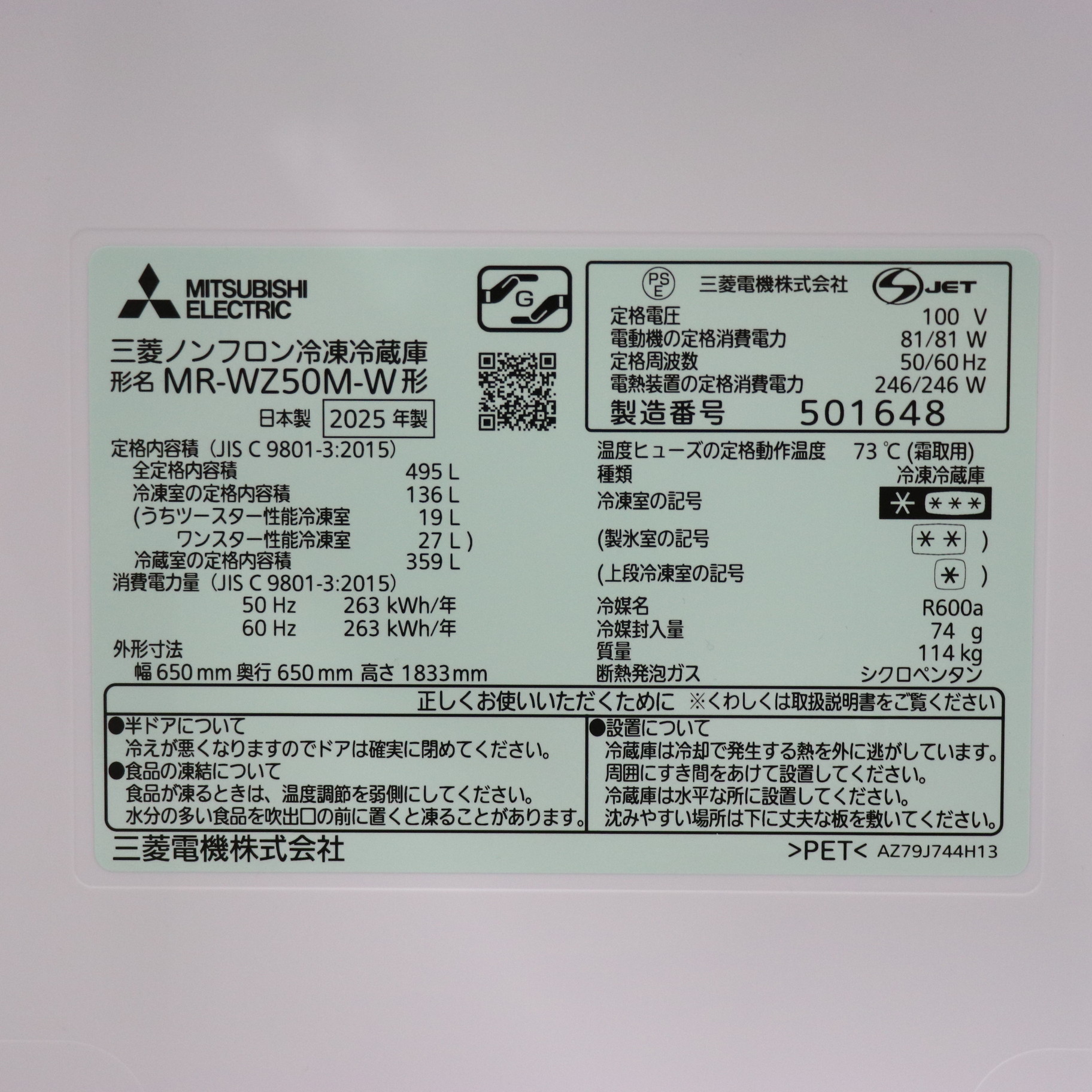 〔展示品〕 冷蔵庫 WZシリーズ グランドリネンホワイト MR-WZ50M-W [幅65cm /495L /6ドア /観音開きタイプ /2025年]