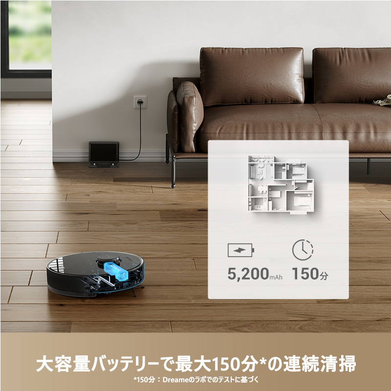 最大150分*の連続清掃を実現する5200mAhバッテリーで、家の隅々まで掃除できます。バッテリー残量が少なくなると、ロボットは自動的に戻って再充電し、その後、中断した場所から掃除を再開して、家全体をきれいにします。