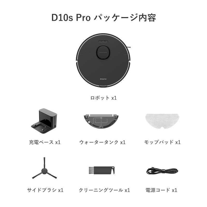 クリーニングツール×1、ダストタンク×1、ウォータータンク×1、ロボット×1、充電ベース×1、サイドブラシ×1、メインブラシ×1、モップパッド×1、電源コード×1