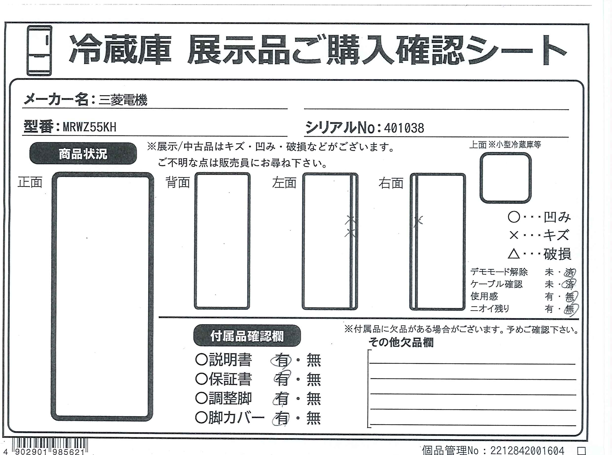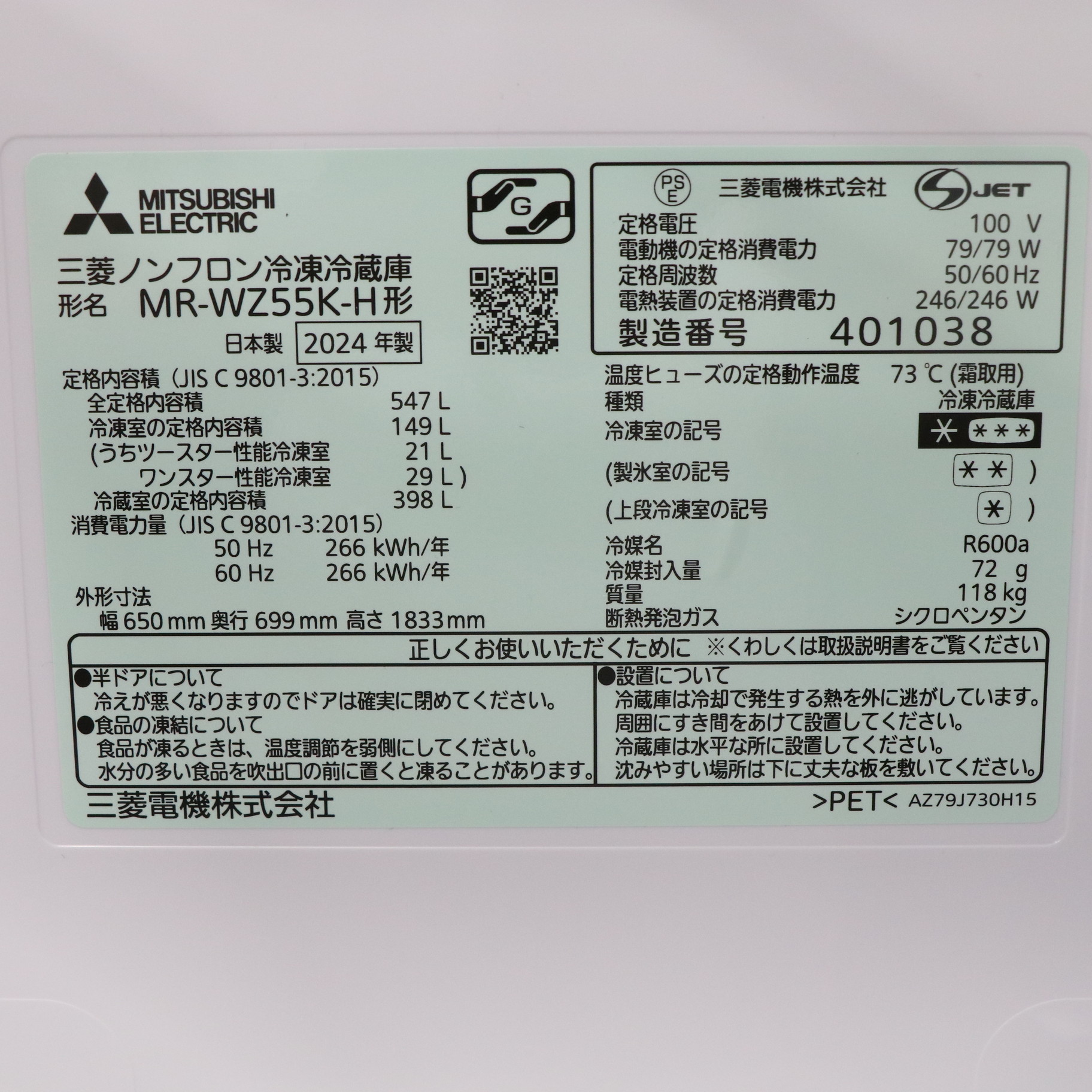 〔展示品〕 冷蔵庫 WZシリーズ グランドアンバーグレー MR-WZ55K-H [幅65cm /547L /6ドア /観音開きタイプ /2024年]