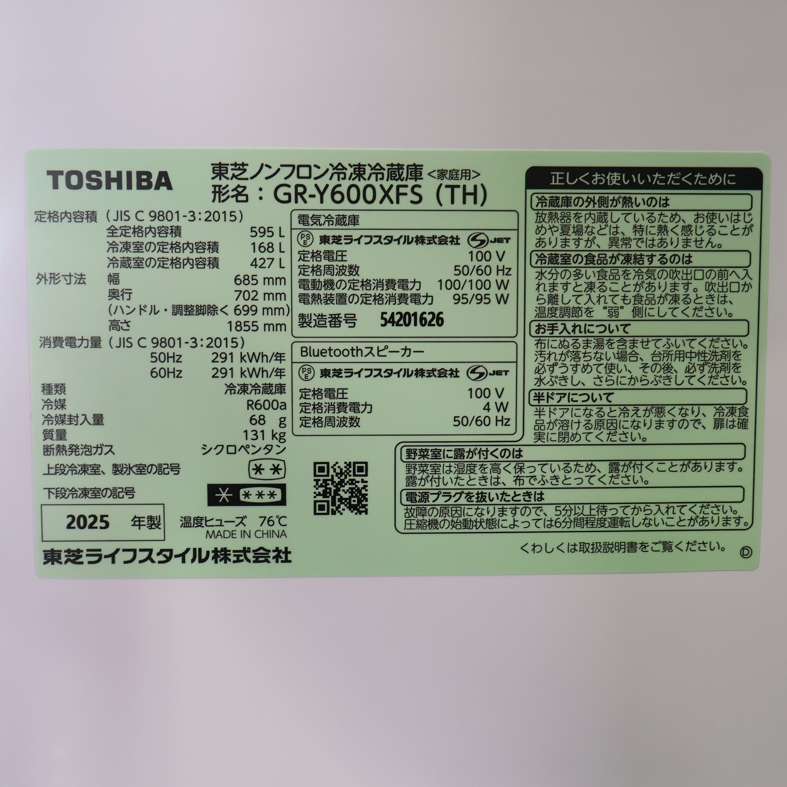 商品名 〔中古品〕 冷蔵庫 VEGETA(ベジータ)XFSシリーズ フロストグレージュ GR-Y600XFS-TH [幅68.5cm /595L /6ドア /観音開きタイプ /2025年]