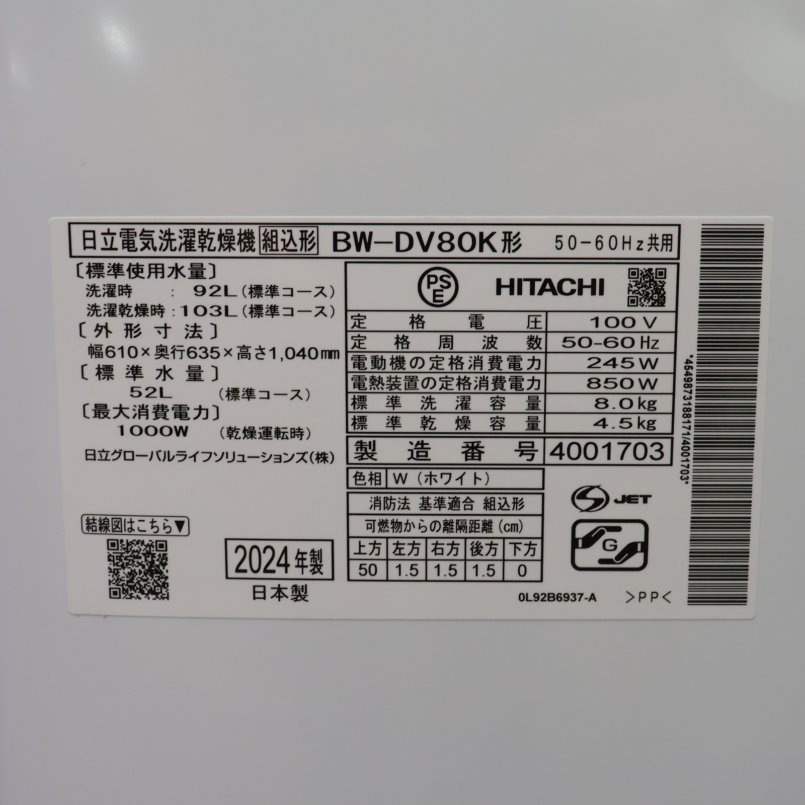 中古商品ランクについて 付属品・商品状態について 〔付属品〕取扱説明書、据付説明書・据付チェックシート、給水ホース