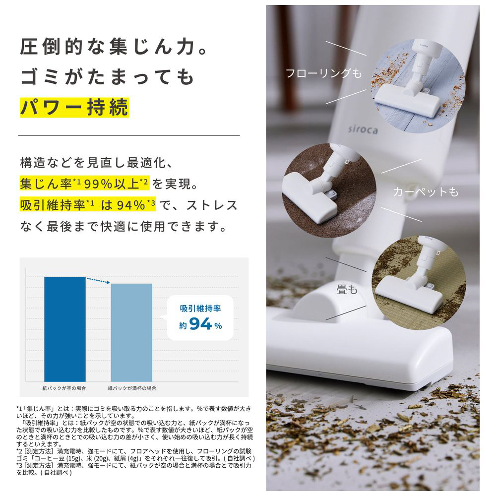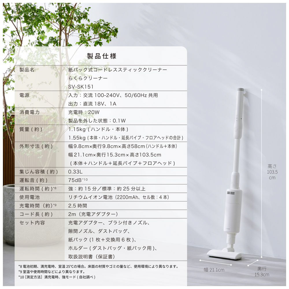 〔展示品〕 紙パック式コードレススティッククリーナー らくらクリーナー siroca ホワイト SV-SK151W [紙パック式 /コードレス]