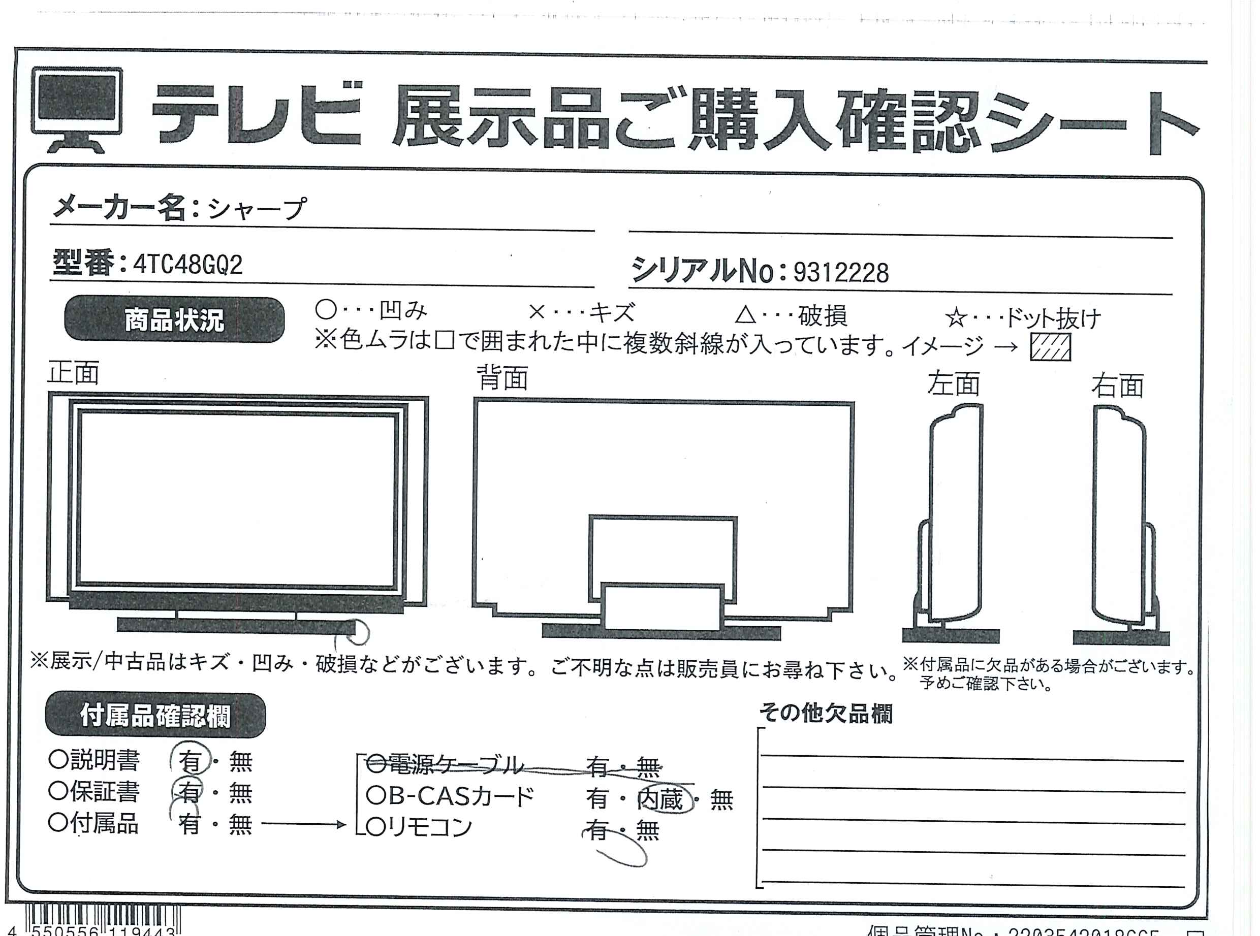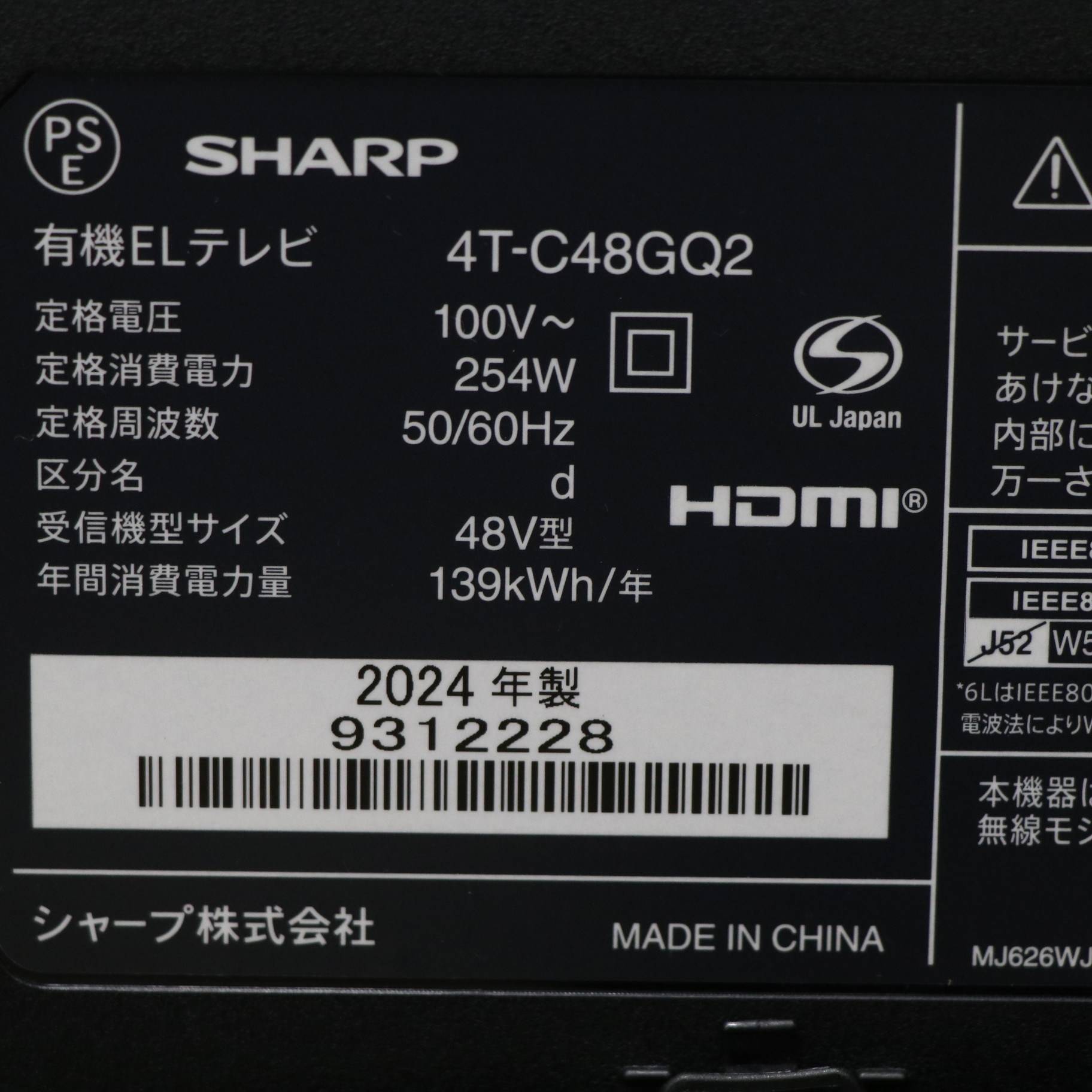 〔展示品〕 有機ELテレビ AQUOS ブラック 4T-C48GQ2 [48V型 /Bluetooth対応 /4K対応 /BS・CS 4Kチューナー内蔵 /YouTube対応]