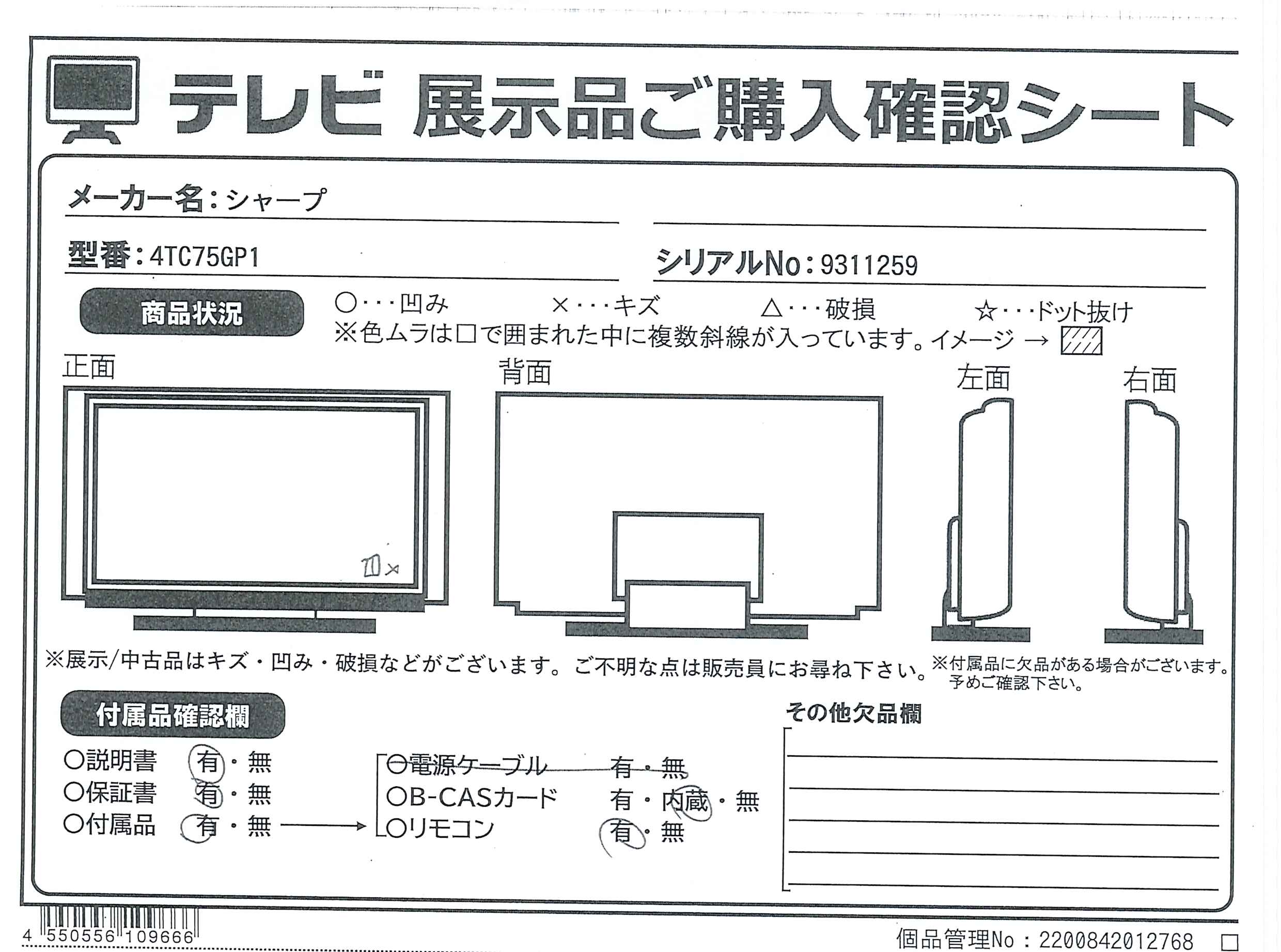 中古商品ランクについて 付属品・商品状態について 〔付属品〕取扱説明書、スタンド取付金具、スタンドカバー、スタンドベース、スタンド組立用ネジ(M5×12mm)×4、スタンド取付用ネジ(M5×12mm)×5、転倒防止ベルト一式、スタンド回転ロックネジ、リモコン、単四形乾電池×2