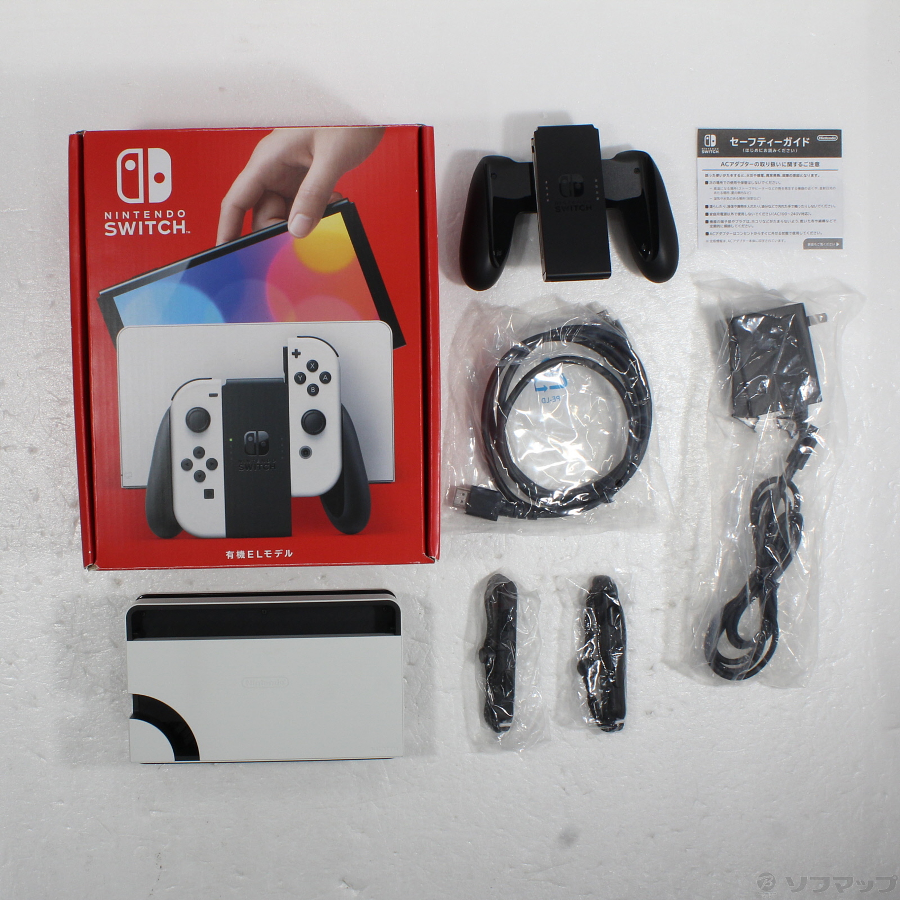 〔付属品〕箱/内箱、セーフティーガイド、ACアダプター、Joy-Con(L) ホワイト、Joy-Con(R) ホワイト、Joy-Conグリップ、Nintendo Switchドック ホワイト、Nintendo Switchドック背面カバー ホワイト、Joy-Conストラップ(1/2)、Joy-Conストラップ(2/2)、ハイスピード HDMIケーブル